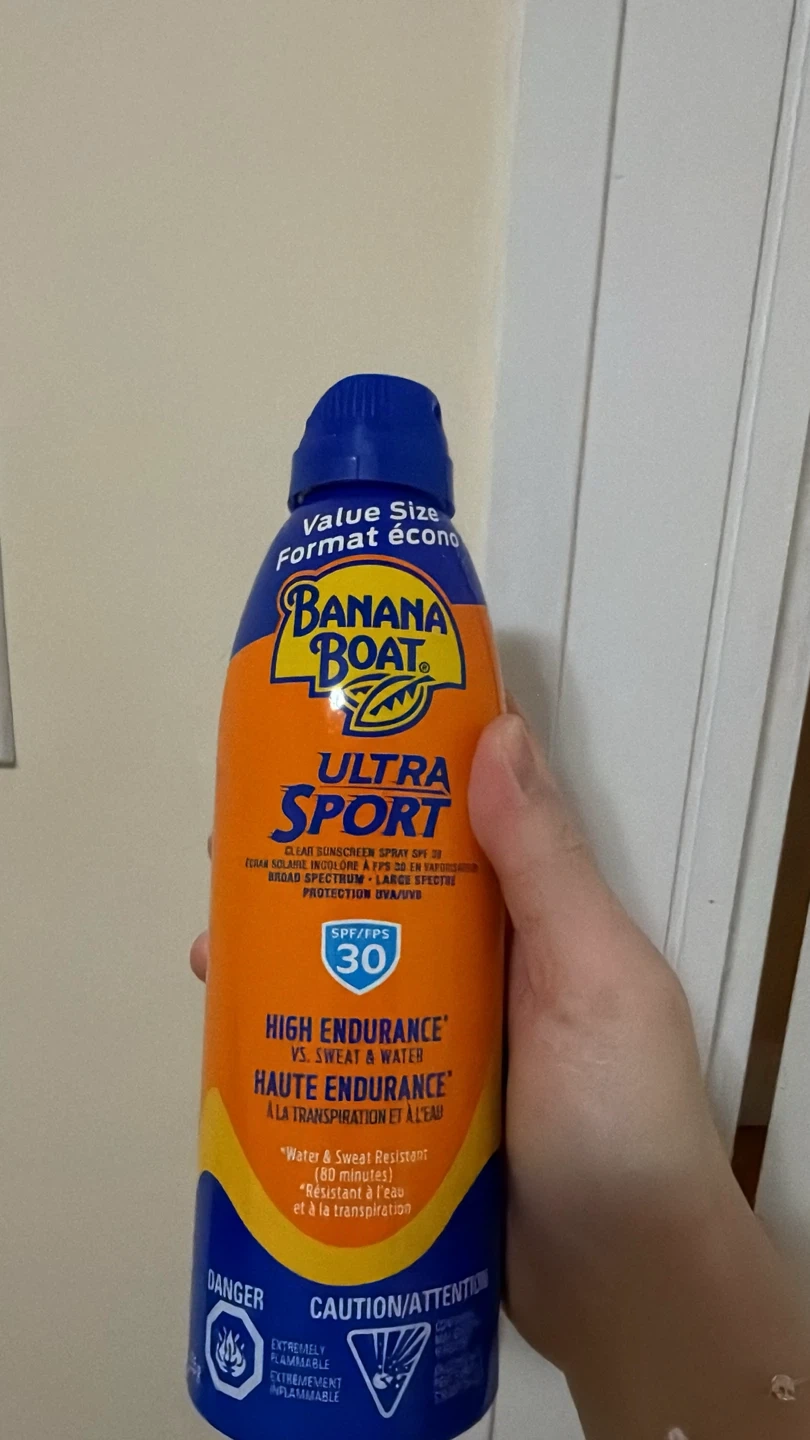 Banana Boat Ultra Sport sunscreen spray with SPF 30. It's clear, broad spectrum, and water & sweat resistant for 80 minutes. This value-size can offers high endurance protection.