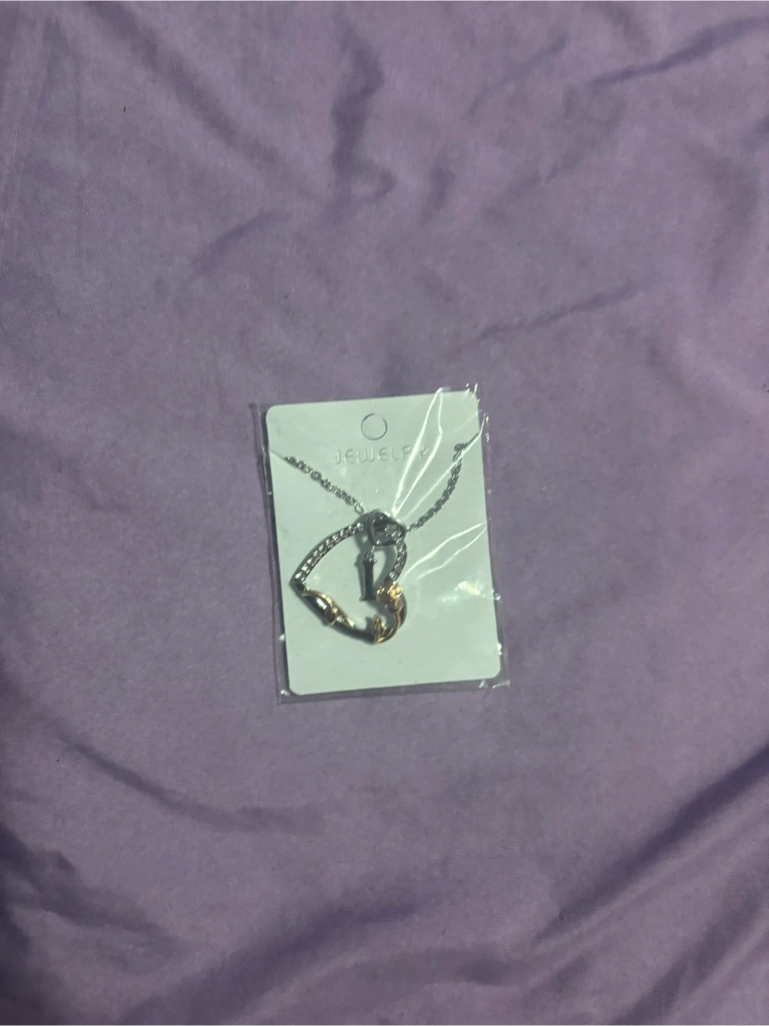 A delicate silver-toned chain with a heart-shaped pendant. The pendant has rose gold accents. It's new and still in its packaging.