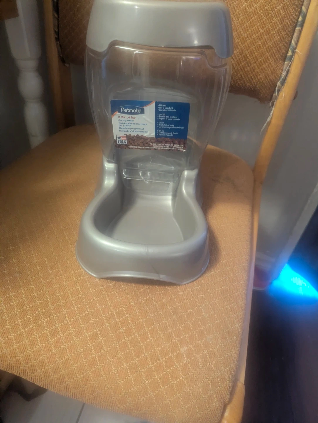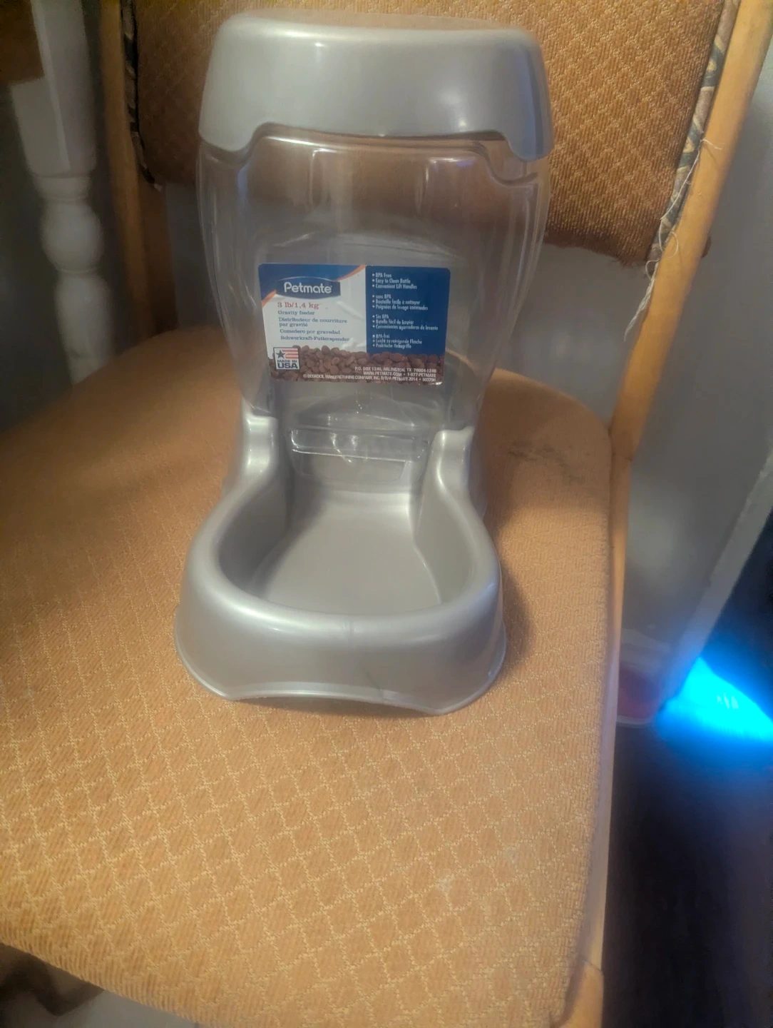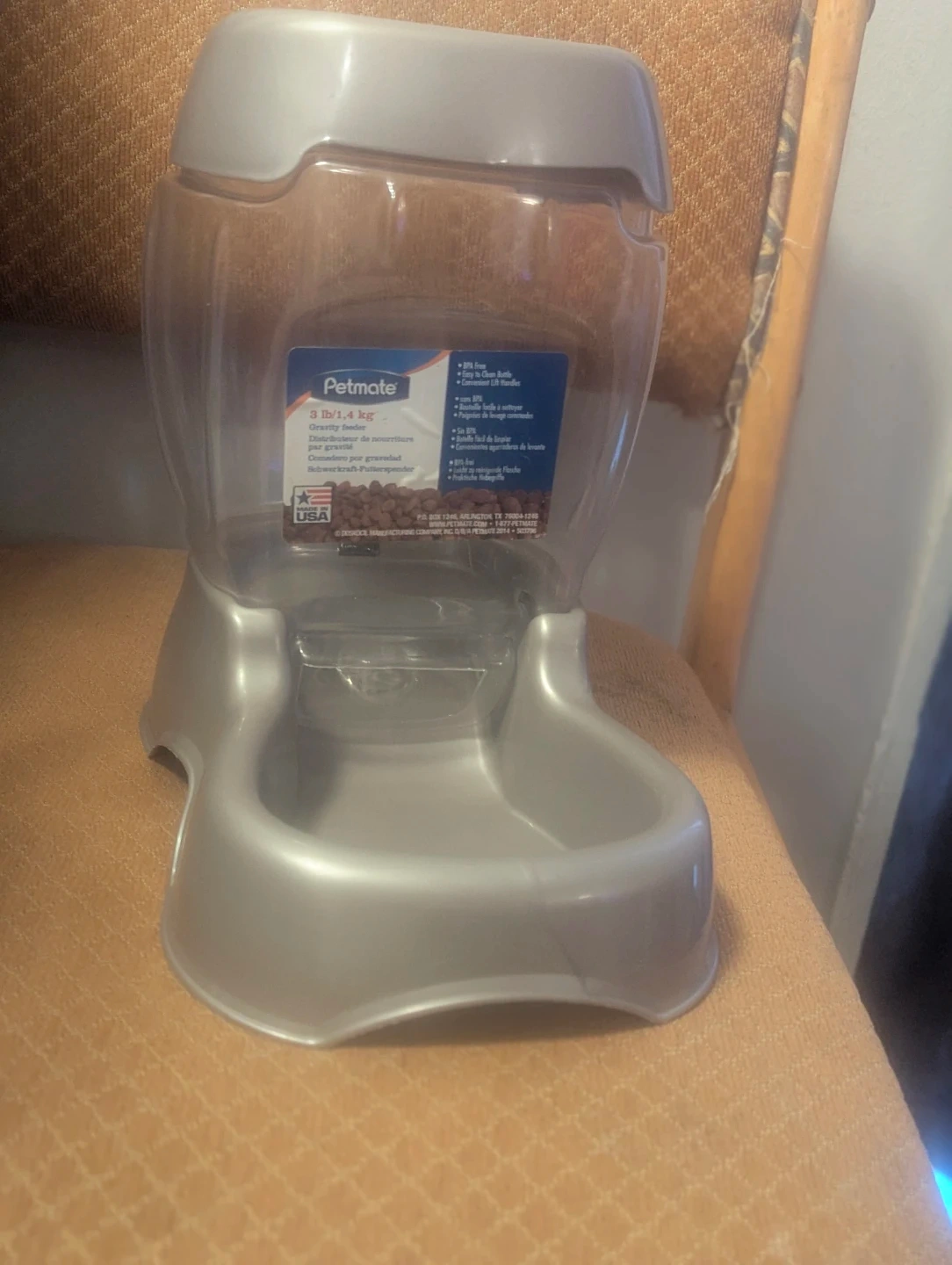Petmate gravity pet food dispenser with a 3 lb / 1.4 kg capacity. Clear reservoir lets you easily see when to refill. Dispenses dry kibble as needed. Made in USA.