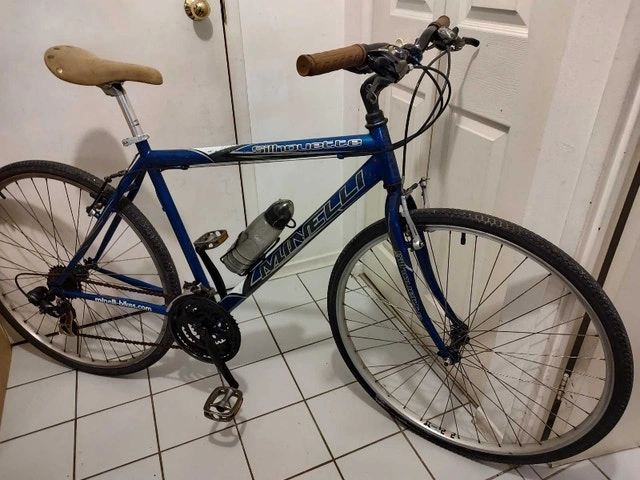 This Minelli Silhouette bicycle has a 20" (50 cm) frame, suitable for riders 5'5" - 6'0". It features a quick-release front wheel and seatpost. The bike is equipped with Shimano Tourney 21-speed derailleurs and Shimano Rapid Fire shifters integrated with the brake levers. It has 700c Alexrims with hybrid tires and a comfortable seat. Includes a bonus bottle holder and red light. The frame has some minor scratches and chipped paint, but overall, the bike is in good condition and ready to ride.