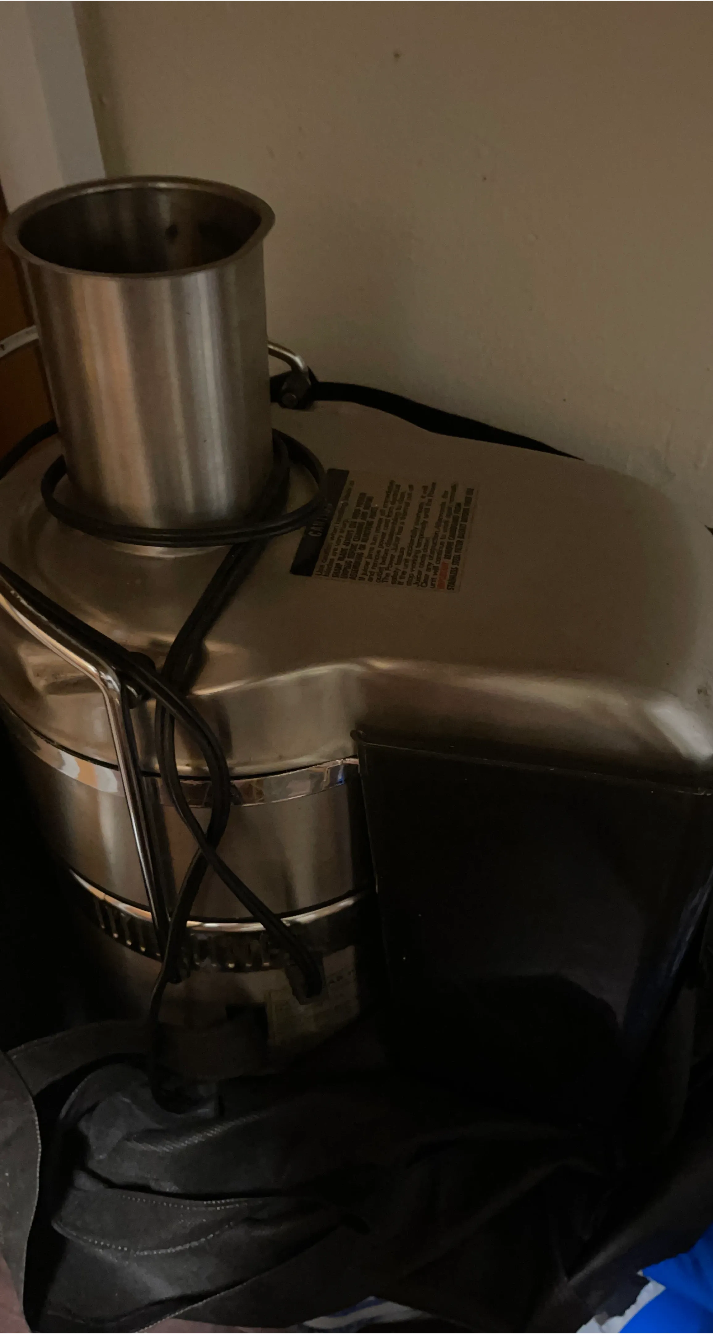 This is a stainless steel juicer. It has a wide chute for easy feeding. The pulp bin is integrated. Works just as good as a new one.