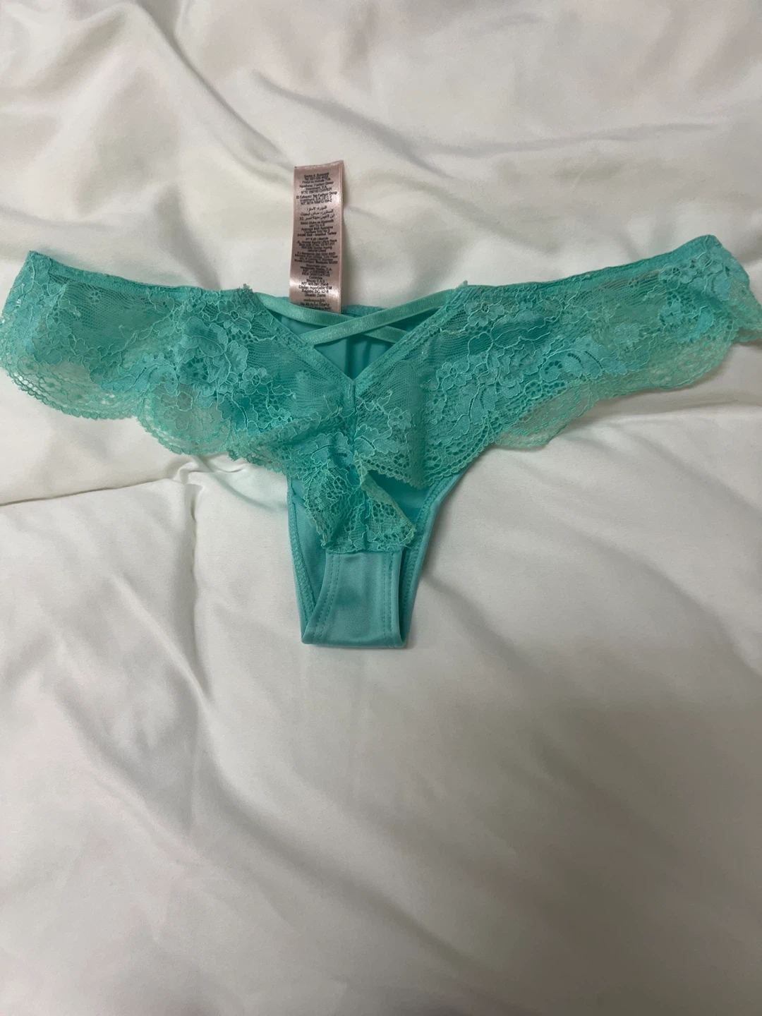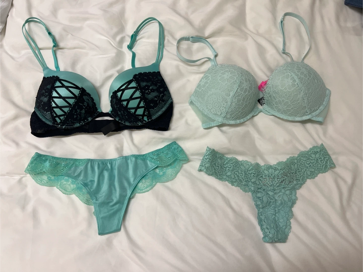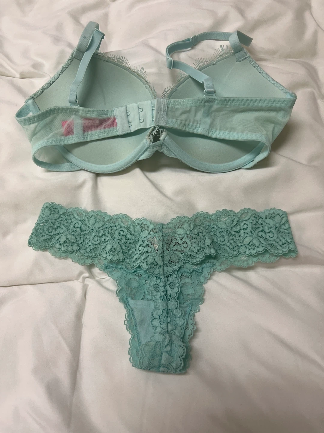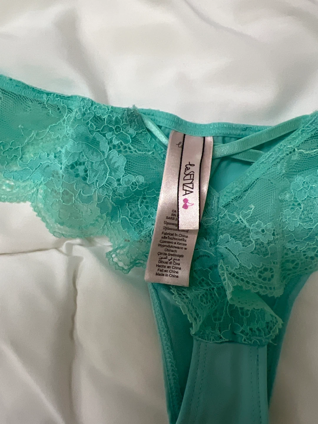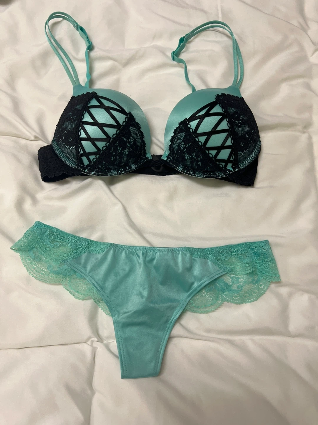 Lovely teal bra and thong set from La Senza. The bra is a push-up style with lace detailing and adjustable straps. The matching thong features a lace waistband. Both are size XS/TP.
