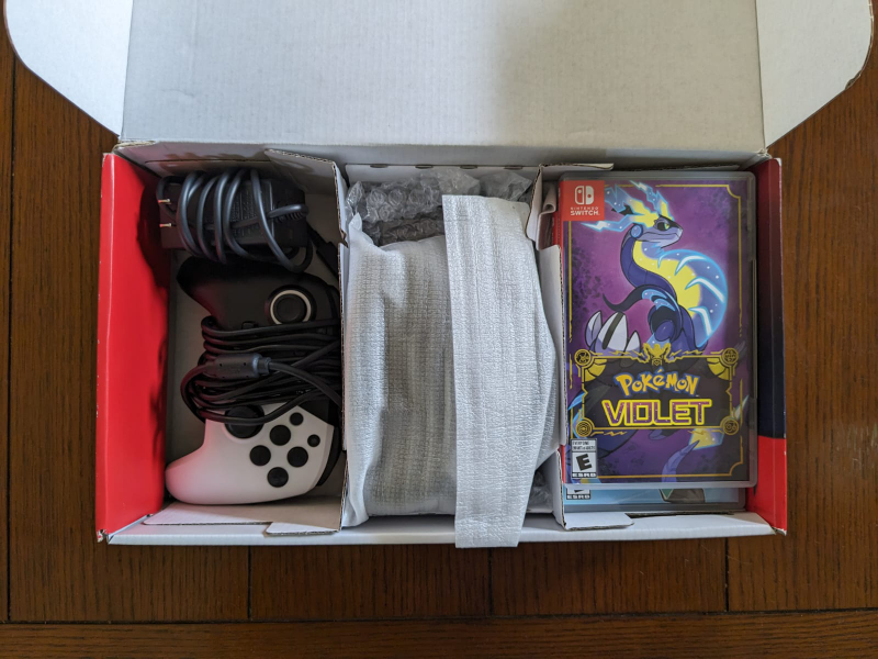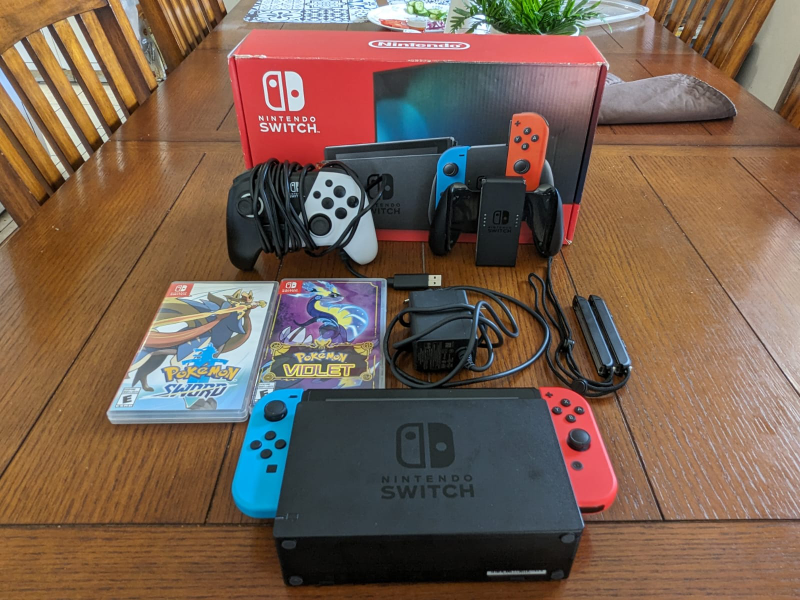 Amazing condition/clean Nintendo switch. Everything together is $400! I believe this is a reasonable price considering what's included. The items included are: Nintendo switch, Joycons, Docking station, Joycon grip, Joycon wrist strap, wired switch pro controller, Original box, and 2 games. Games: Pokemon Violet & Pokemon Sword Reason for selling: Don't use it too often You can also buy some items individually: Nintendo switch + accessories: $350 Pokemon Violet: $60 Pokemon Sword: $50 I will hand everything over in the original box, feel free to message me if you have any questions or if you are interested.