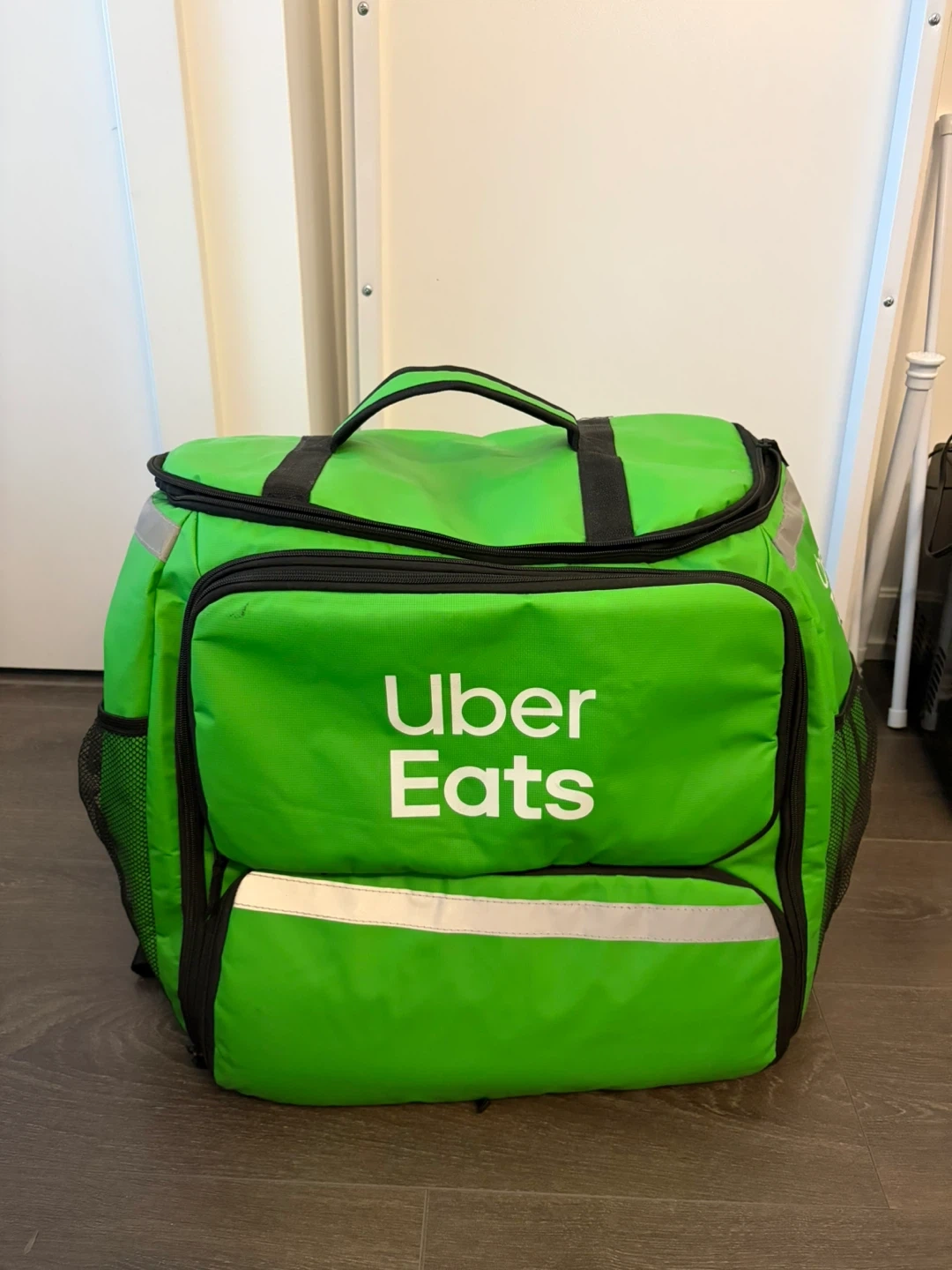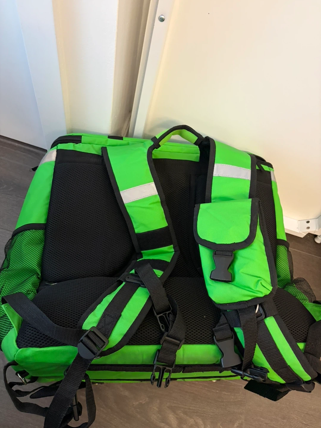 This is an Uber Eats branded delivery backpack. It's bright green with reflective strips for visibility. The bag has multiple pockets and padded straps for comfort. It's a great bag for food delivery drivers!