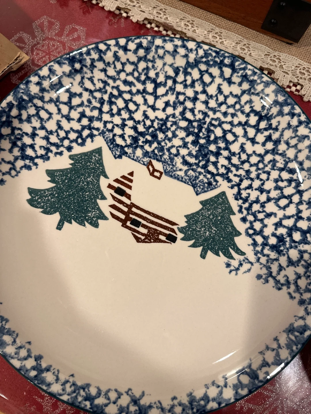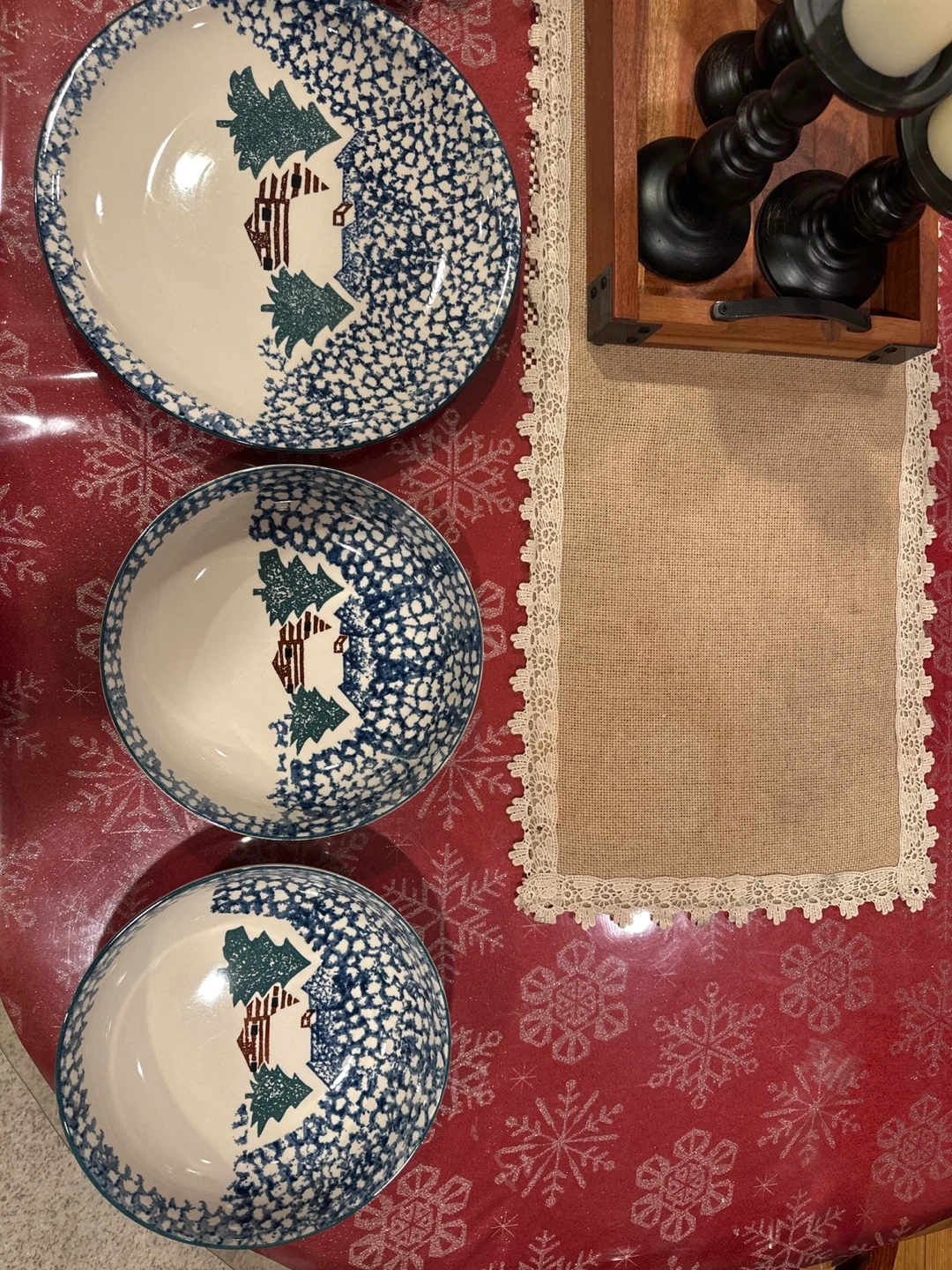 Selling a charming Cabin in the Snow 3-piece serving set by Folk Craft. This set includes two 5-inch vegetable bowls and one 12-inch round platter. Perfect for adding a festive touch to your table!