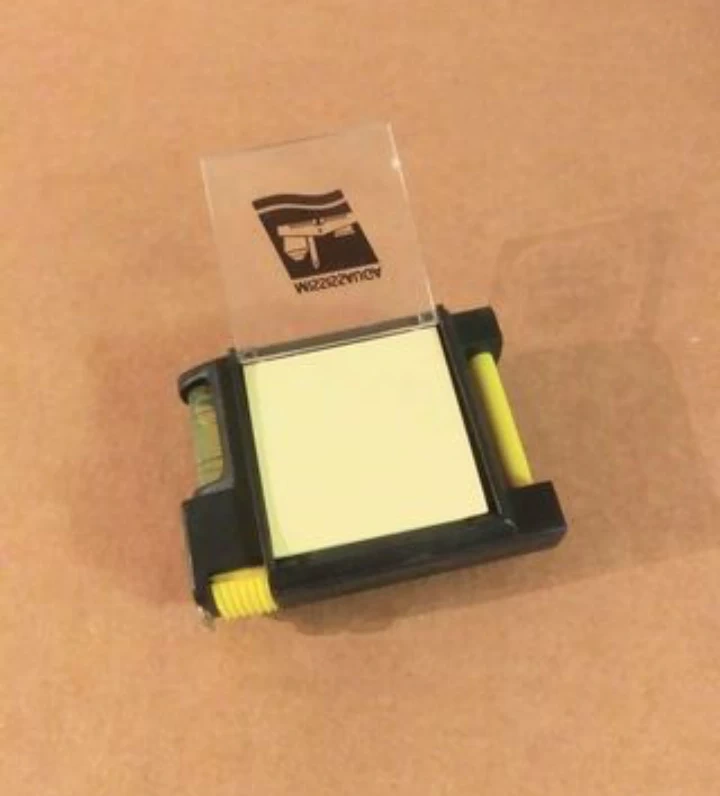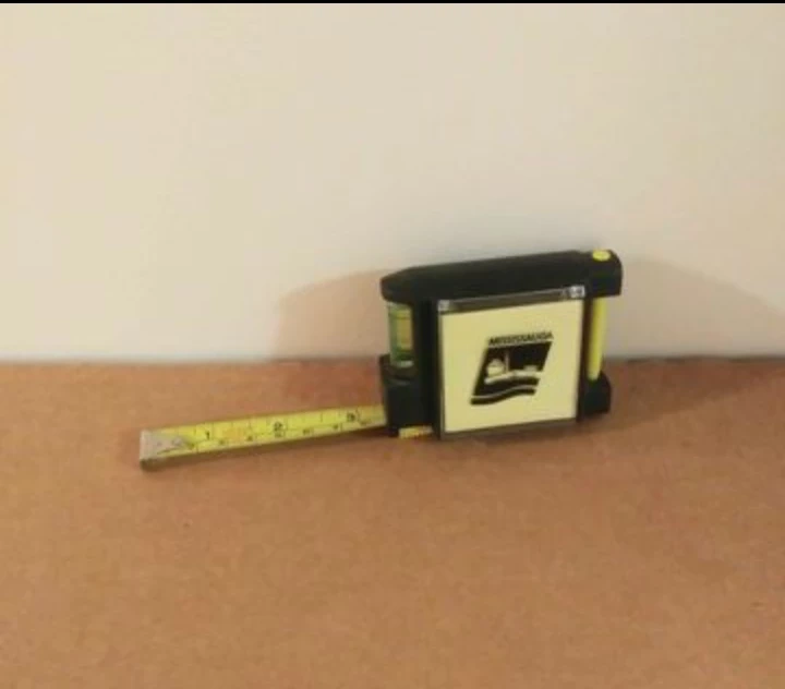 This small and compact tape measure is a "must have" for everyone. This new, easy-to-use, multipurpose gadget has a retractable 10 feet tape measure, spirit level, and small memo pad. It also has a handy belt clip on the back.