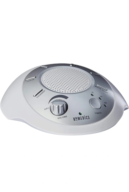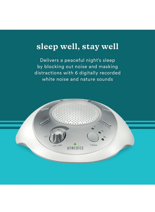 Homedics White Noise Sound Machine ▪ Silver ▪ Small Travel Sound Machine with 6 Relaxing Nature Sounds ▪ Portable Sound Therapy for Home, Office, Nursery ▪ Auto-Off Timer https://a.co/d/90dwmlA