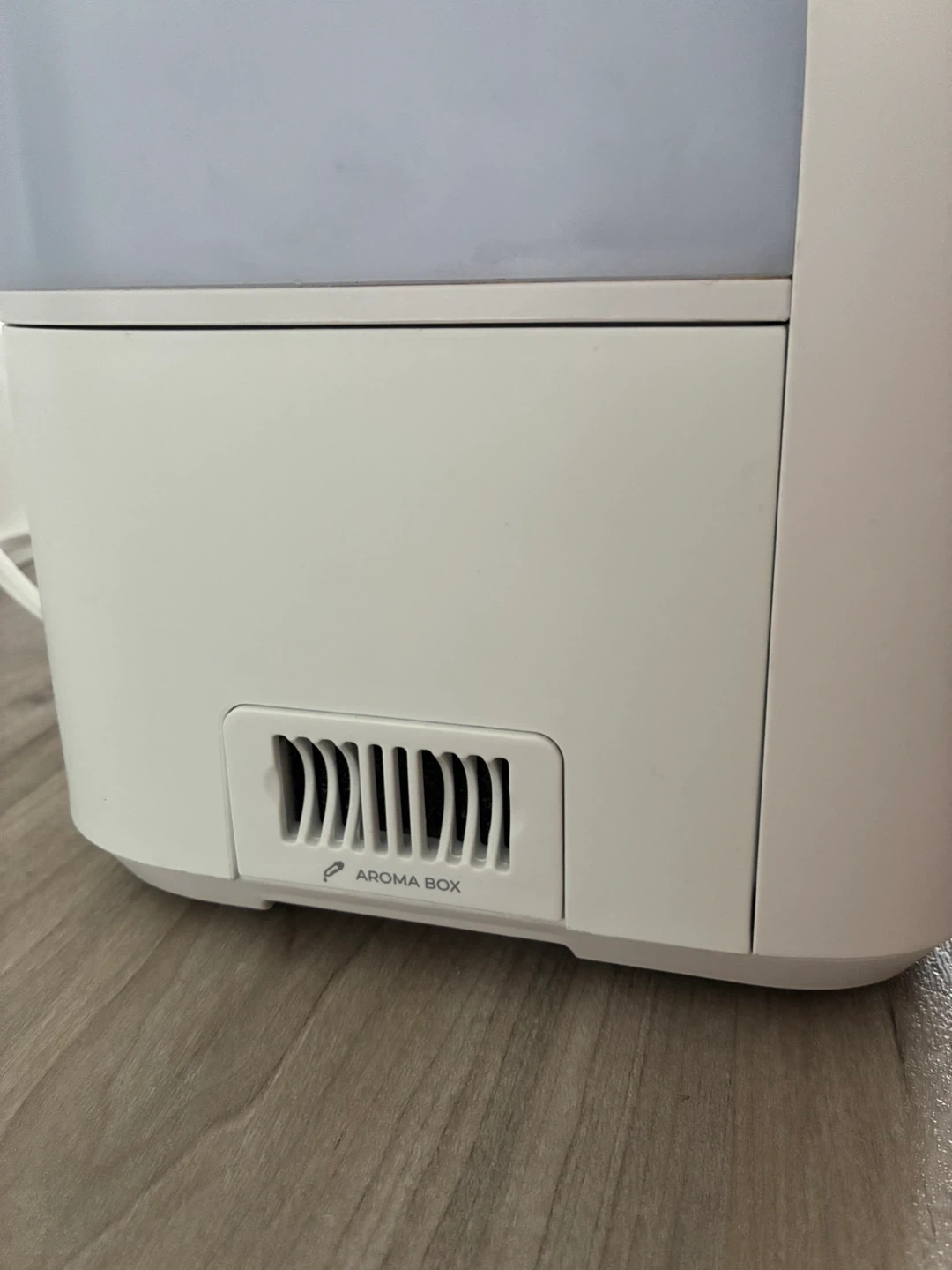Homvana humidifier with essential oil tray and remote control. Includes cleaning brush, extra filters, and a foam piece. Features heating, auto, sleep modes, and adjustable mist levels.