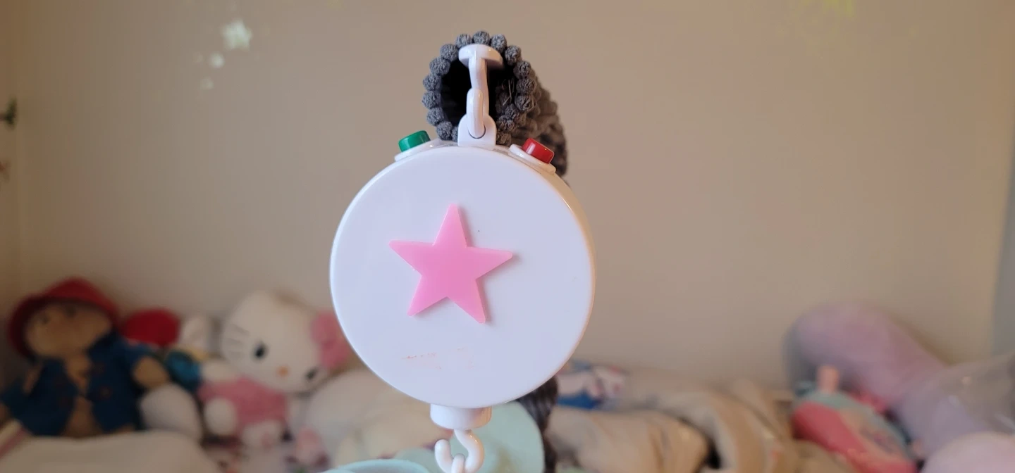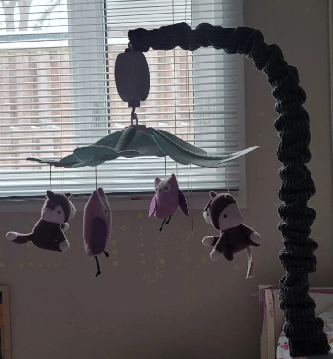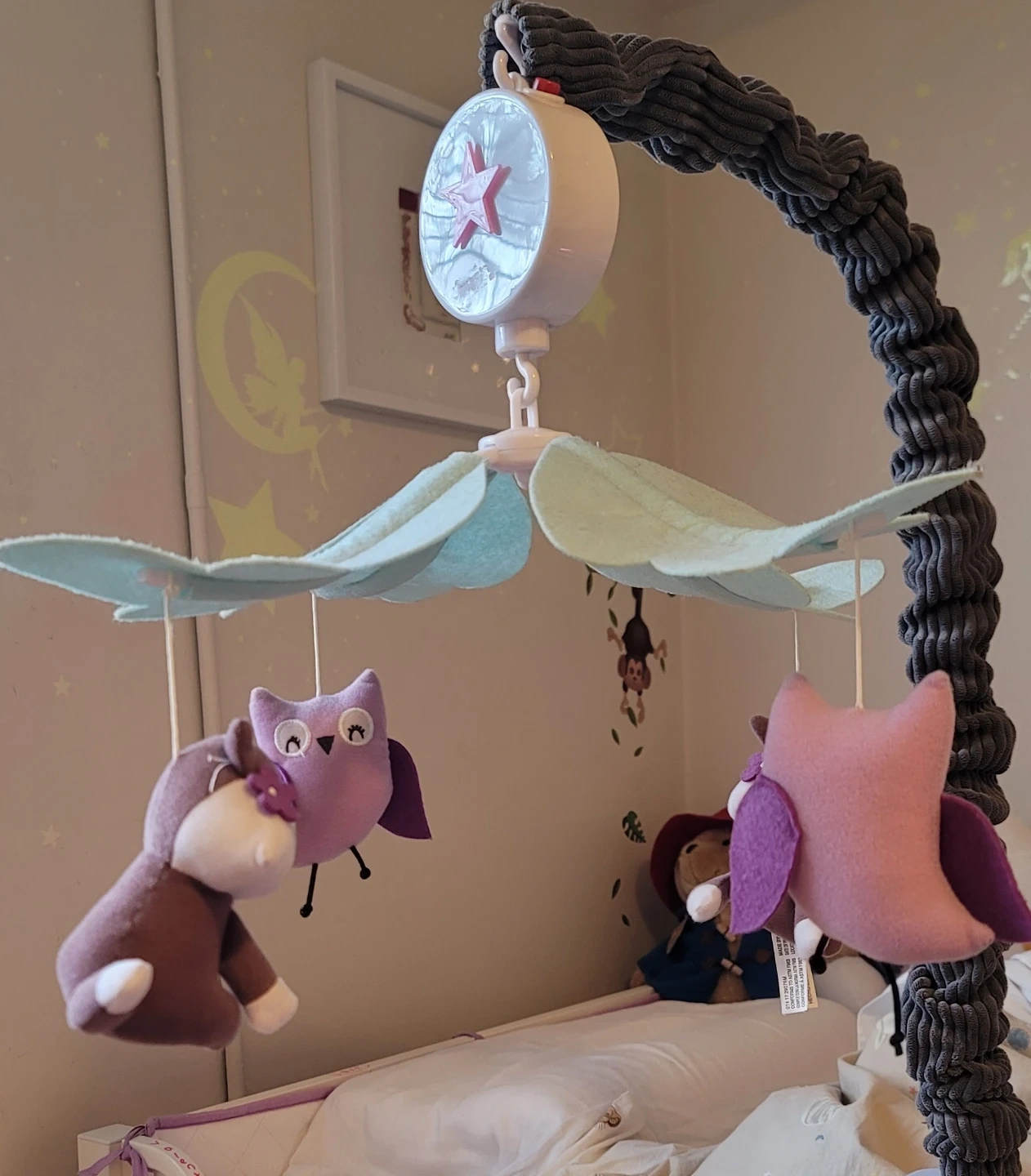 A cute baby mobile featuring plush owls and foxes! It's in great condition and ready to soothe your little one to sleep. The mobile has a star-shaped music box -with batteries that plays a lullabies while the plush animals gently rotate around.