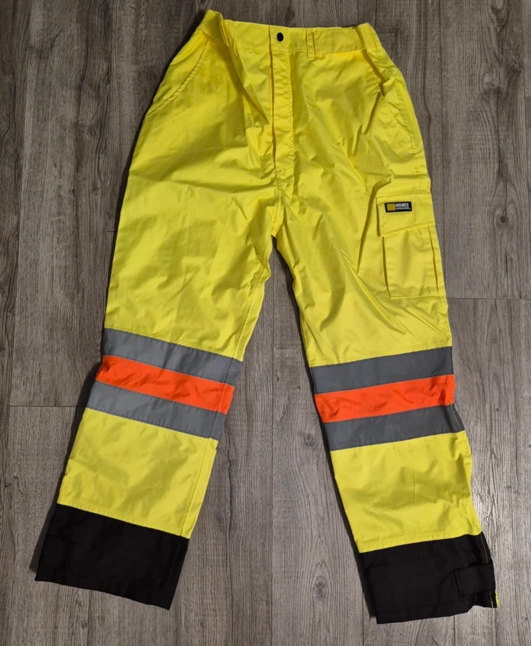 High-visibility yellow work pants with reflective stripes. These pants feature a cargo pocket on the right leg. Durable material for demanding jobs.