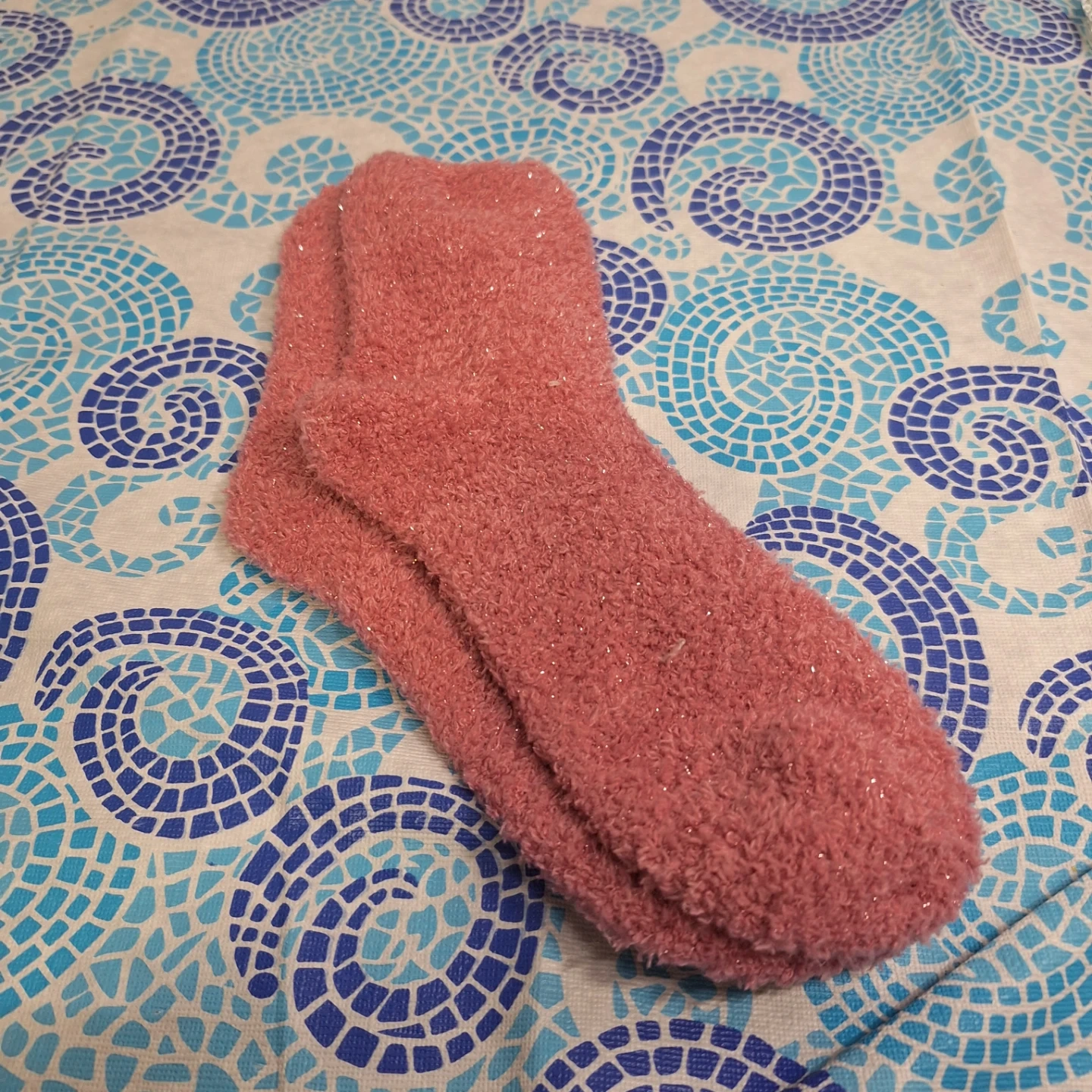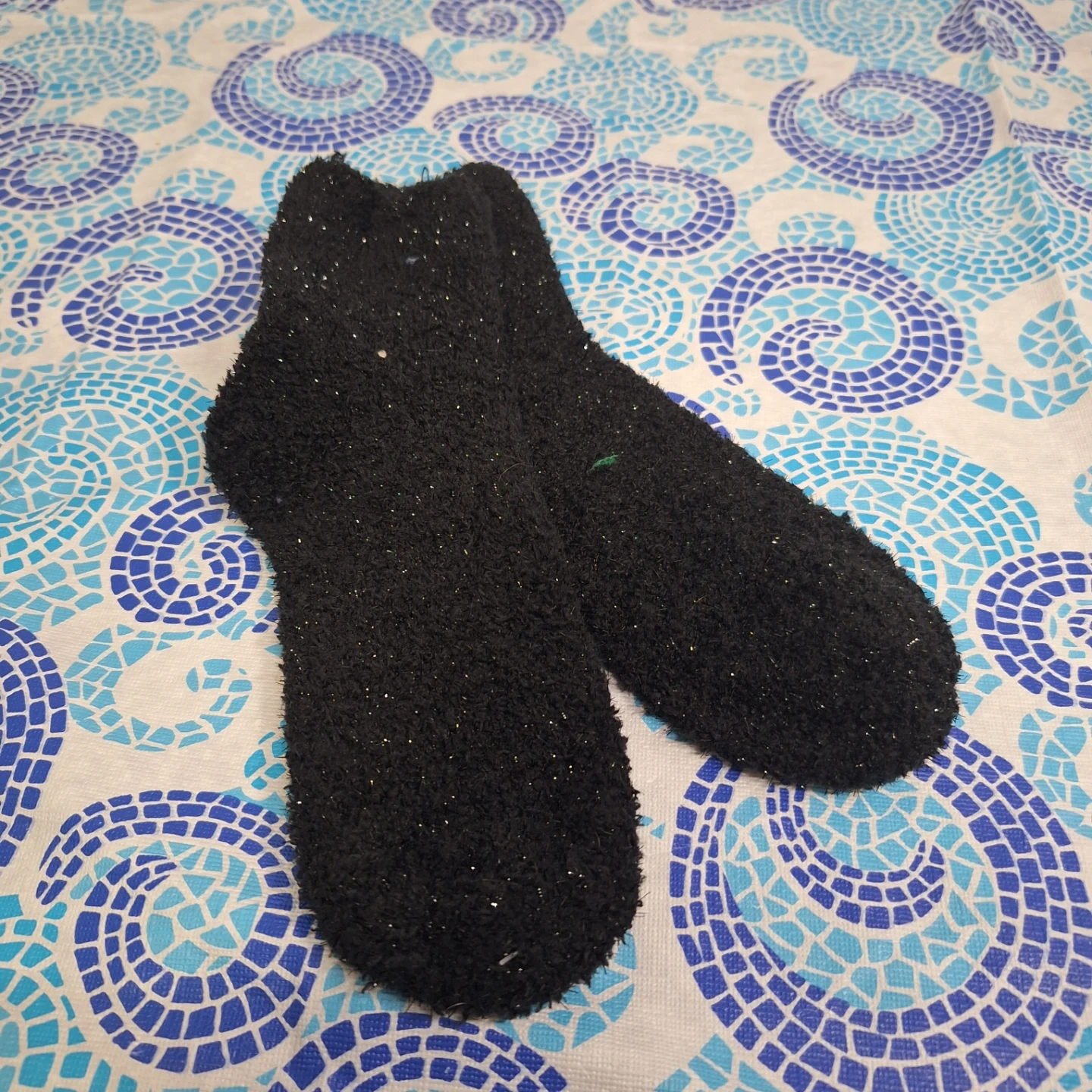 These cozy fuzzy socks have a subtle sparkle woven in. They're super soft and comfy for lounging around the house. Available in teal, cream, pink, blue, and black. One size fits most.