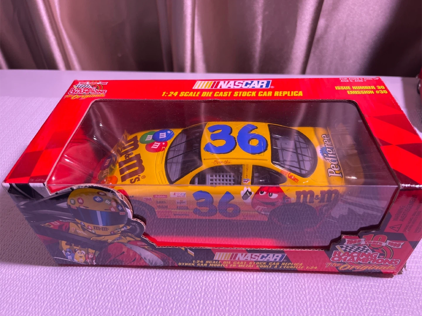 Selling a Racing Champions 1:24 scale diecast stock car replica of the M&M's #36 Pontiac Grand Prix. It's issue number 30. This is a Racing Champions 10th Anniversary car for the collector 1999 Ernie Irvin