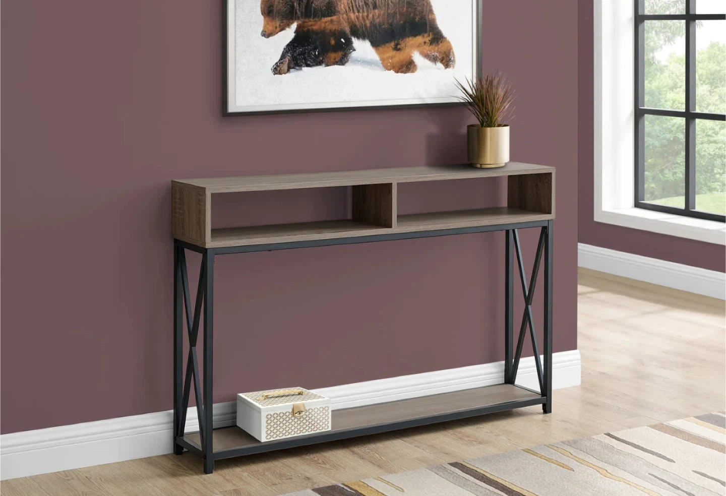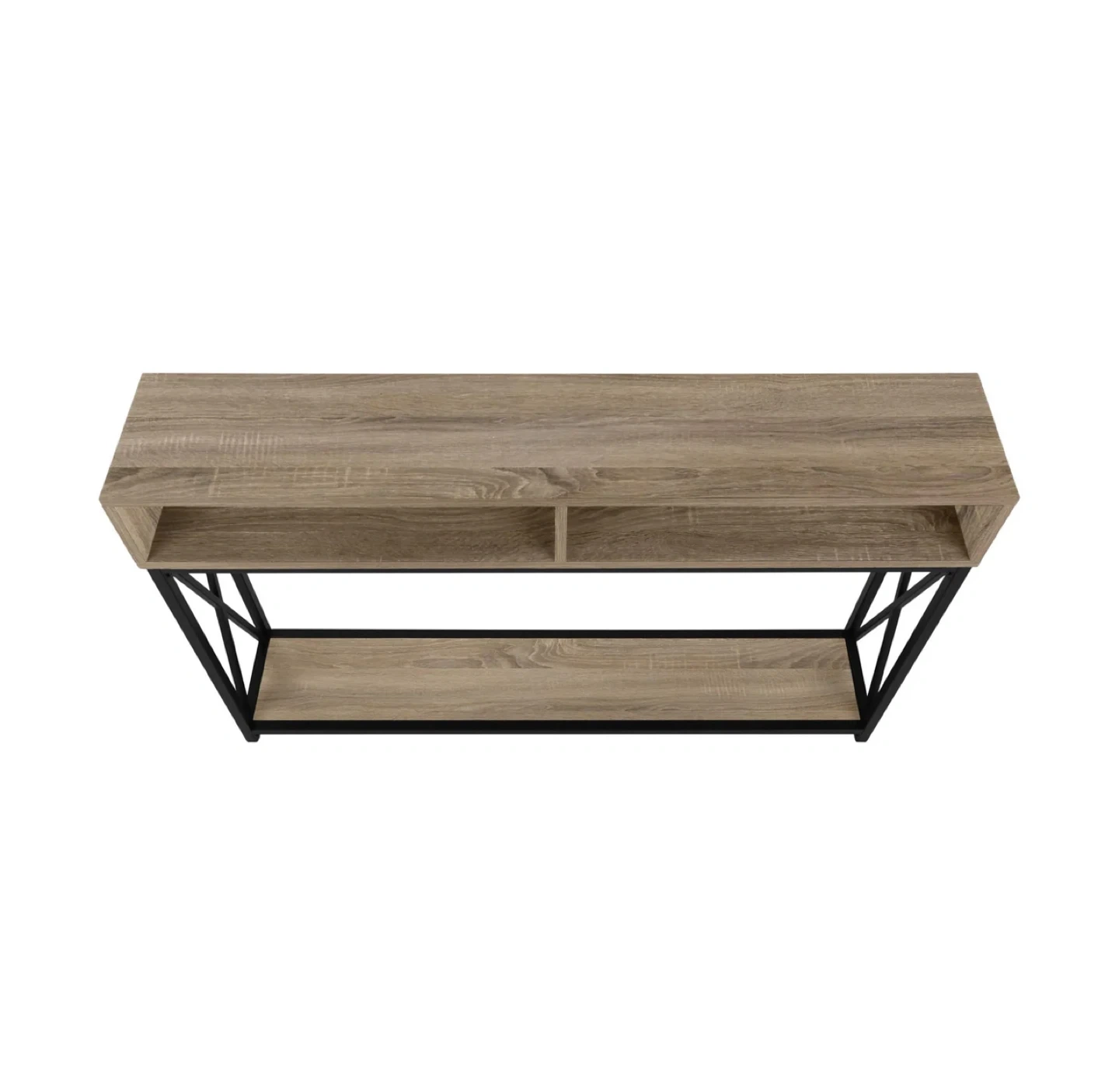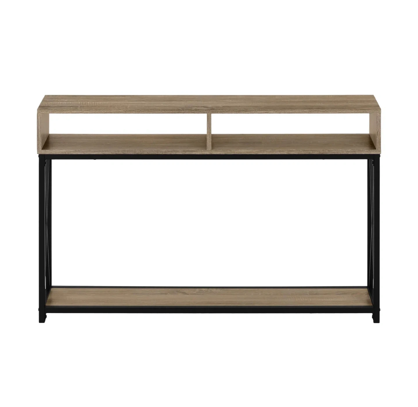 Excellent condition. This console table features a rustic wood top and a lower shelf, supported by a black metal frame. It offers two open cubbies on top and a wider shelf below. The slim design makes it a good fit for entryways or narrow spaces.