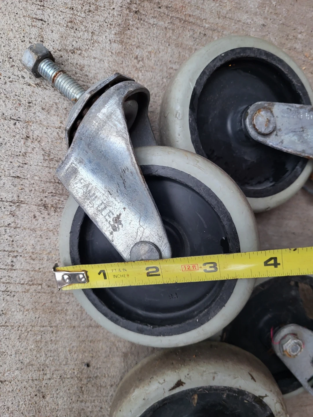Four caster wheels with metal brackets and threaded bolts. The wheels have grey rubber treads and black centres. These are replacements for rolling carts or furniture.