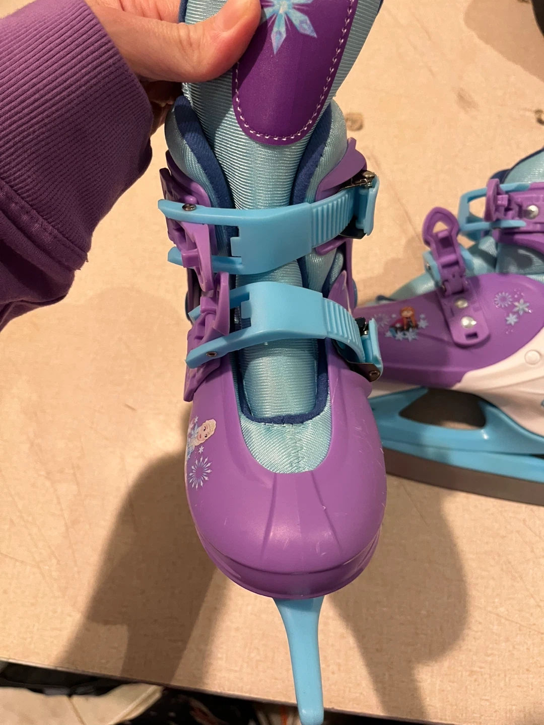 Kids' adjustable ice skates featuring Elsa and Anna from Disney's Frozen. The skates have a purple and blue design with adjustable straps for a secure fit. Blades are made of stainless steel.