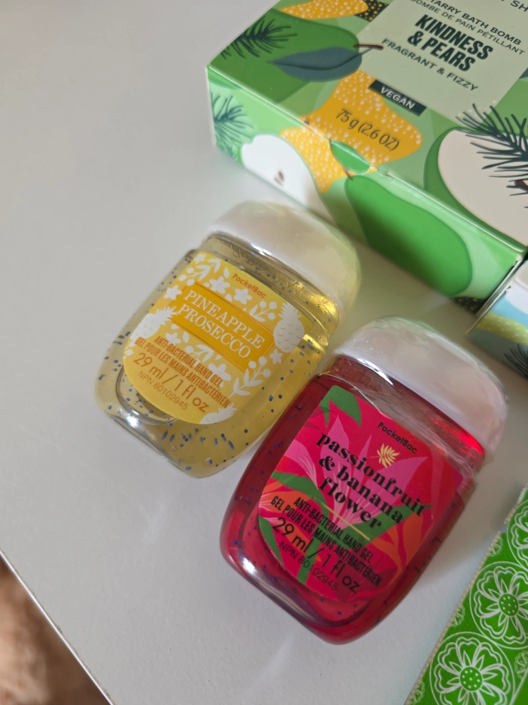 Two bath and body works hand sanitizers: Pineapple Prosecco and Passionfruit & Banana Flower.