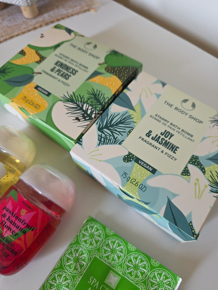 Two The Body Shop Starry Bath Bombs: Kindness & Pears and Joy & Jasmine.