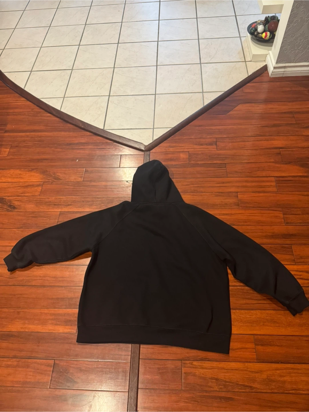 Black hoodie from Fear of God Essentials. It's a comfortable pullover style with a front pouch pocket. Made with a soft fabric blend.