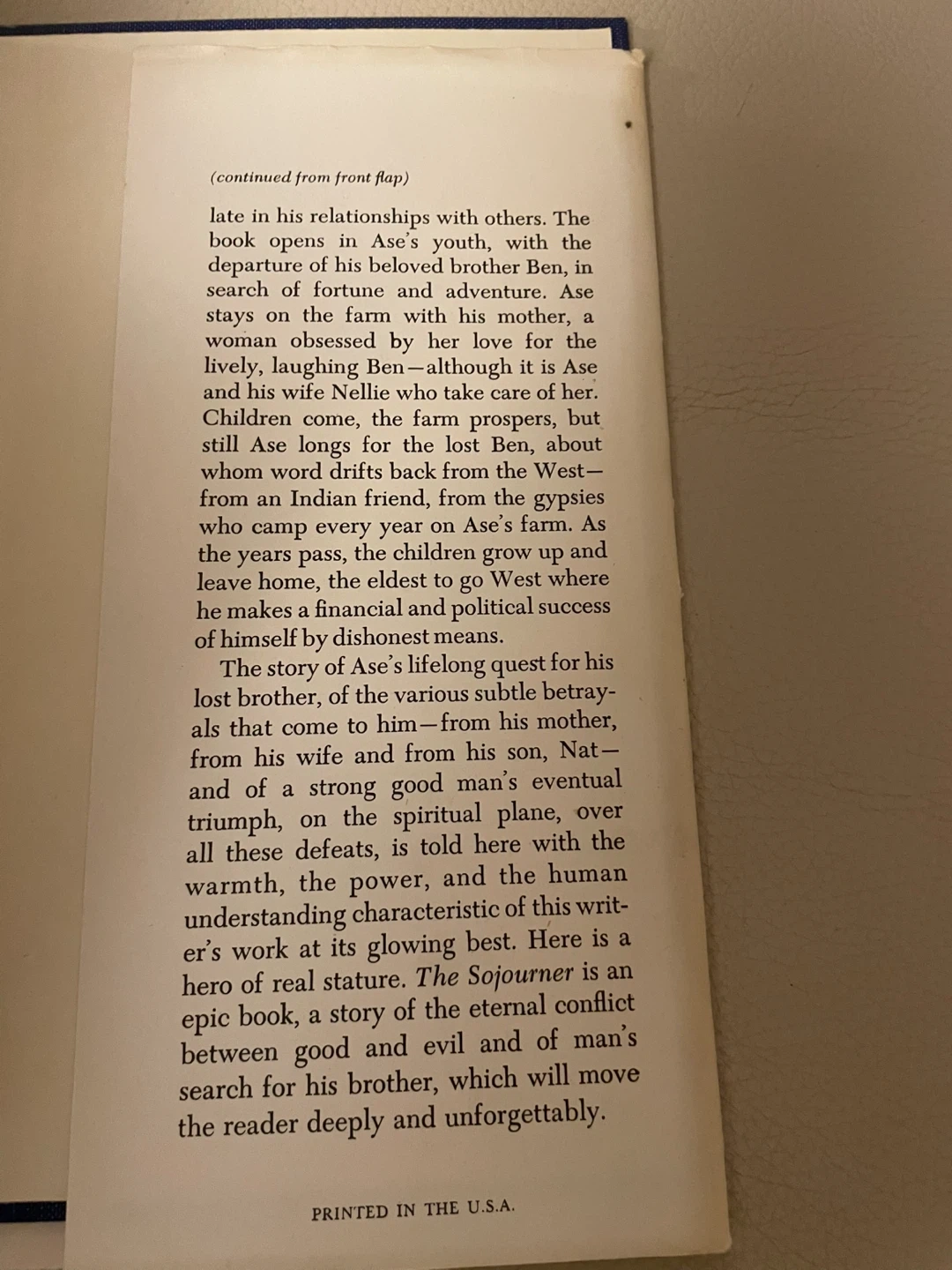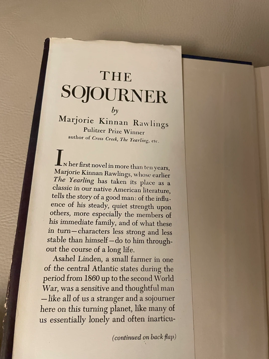 This is a novel titled The Sojourner by Pulitzer Prize winner Marjorie Kinnan Rawlings. It tells the story of Asahel Linden, a small farmer in the central Atlantic states during the period from 1860 up to the second World War. The book explores themes of loneliness and the search for connection.
