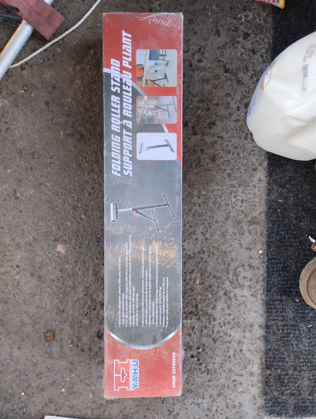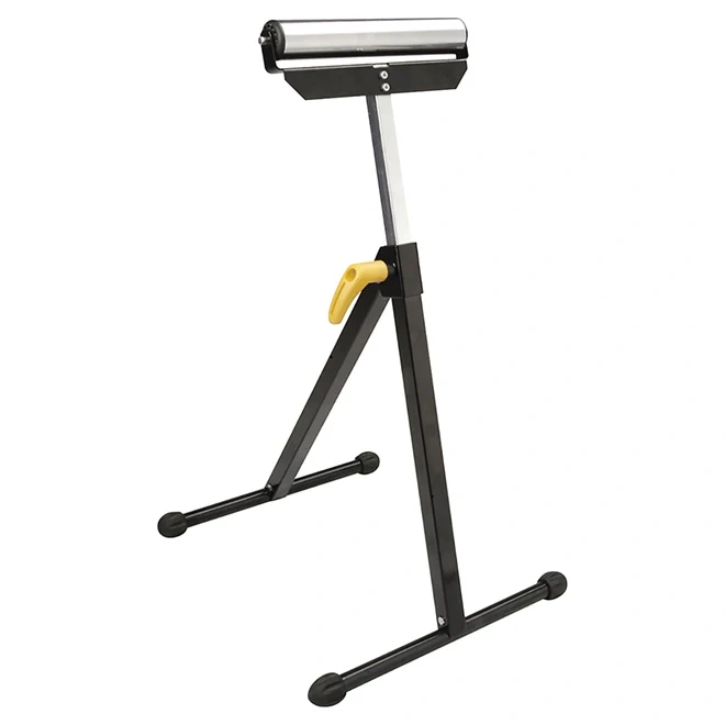This YAHU folding roller stand supports heavy wood and metal stock up to 130 lbs. It extends up to 43 inches high and folds flat for easy storage. This roller stand is ideal for use with jointers, planers, table saws, band saws, chop saws, and mitre saws.