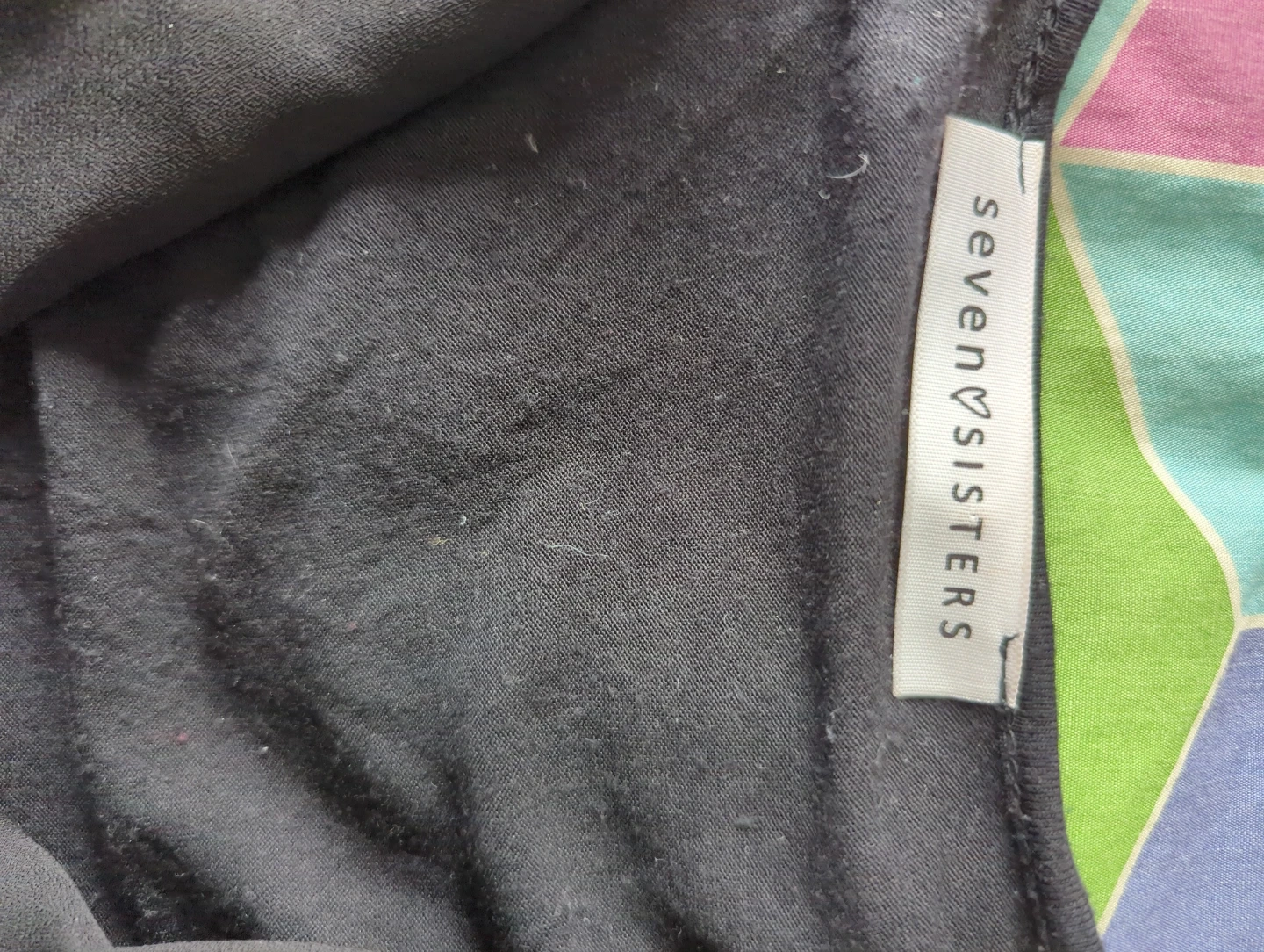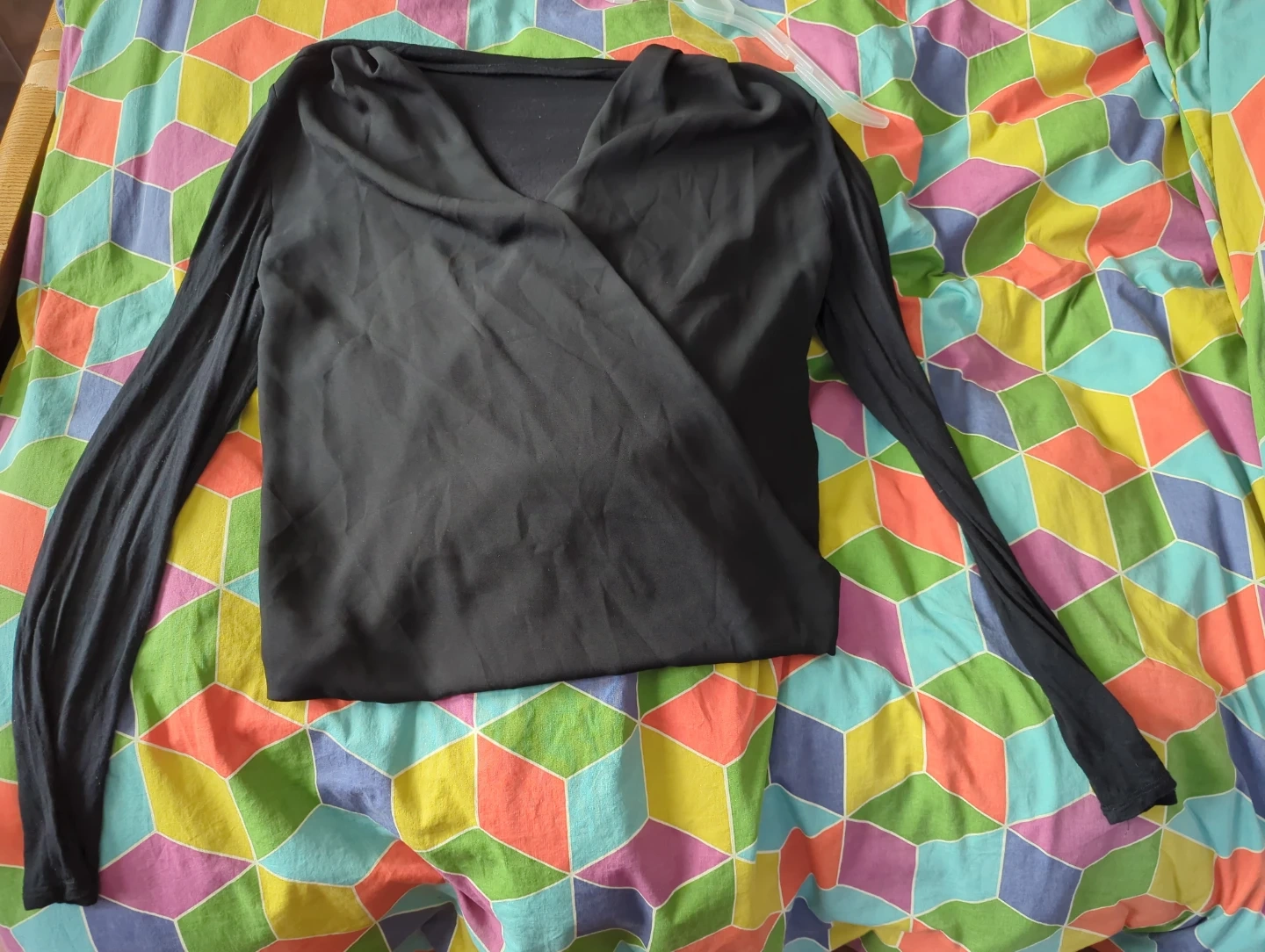 A black long-sleeve wrap top from Seven Sisters. It's a size medium with a V-neckline. This top is made from a soft, drapey fabric.