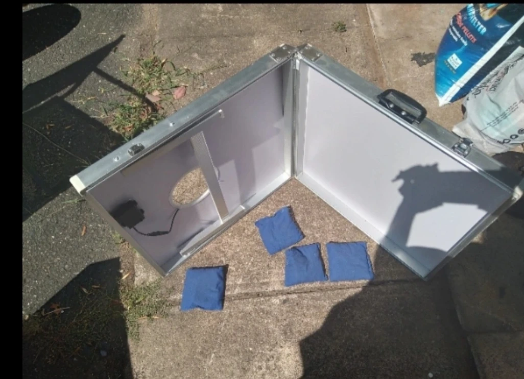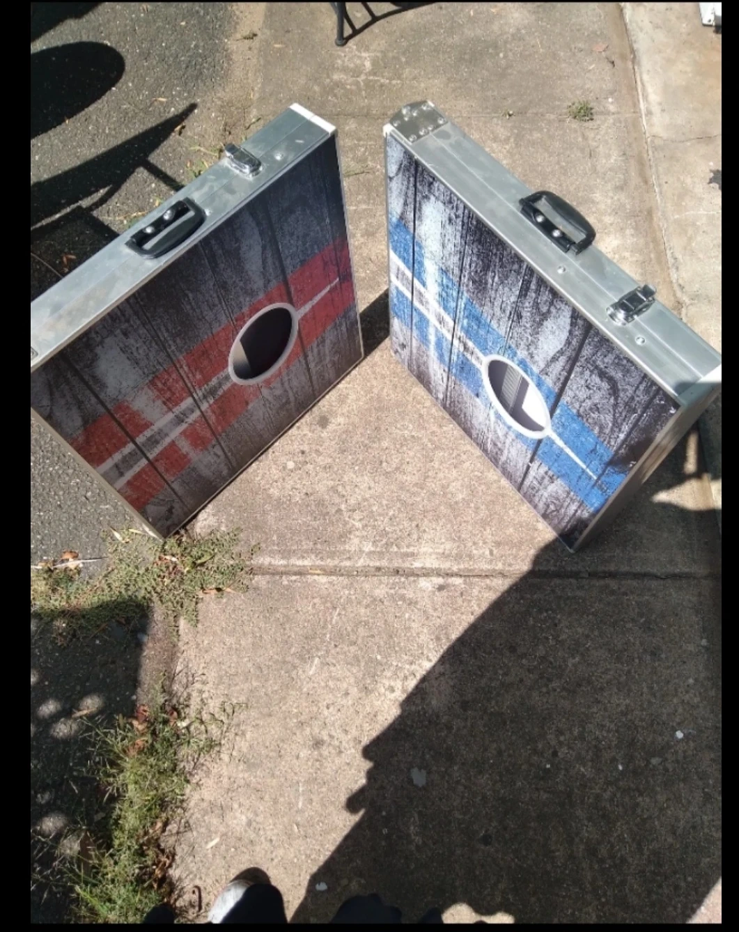 This is a foldable cornhole set with two boards, one featuring a blue stripe design and the other a red stripe design. It includes 8 bean bags, 4 blue and 4 red. The boards have a distressed wood look and are housed in a silver aluminum case for portability. This set is great for outdoor gatherings and parties!