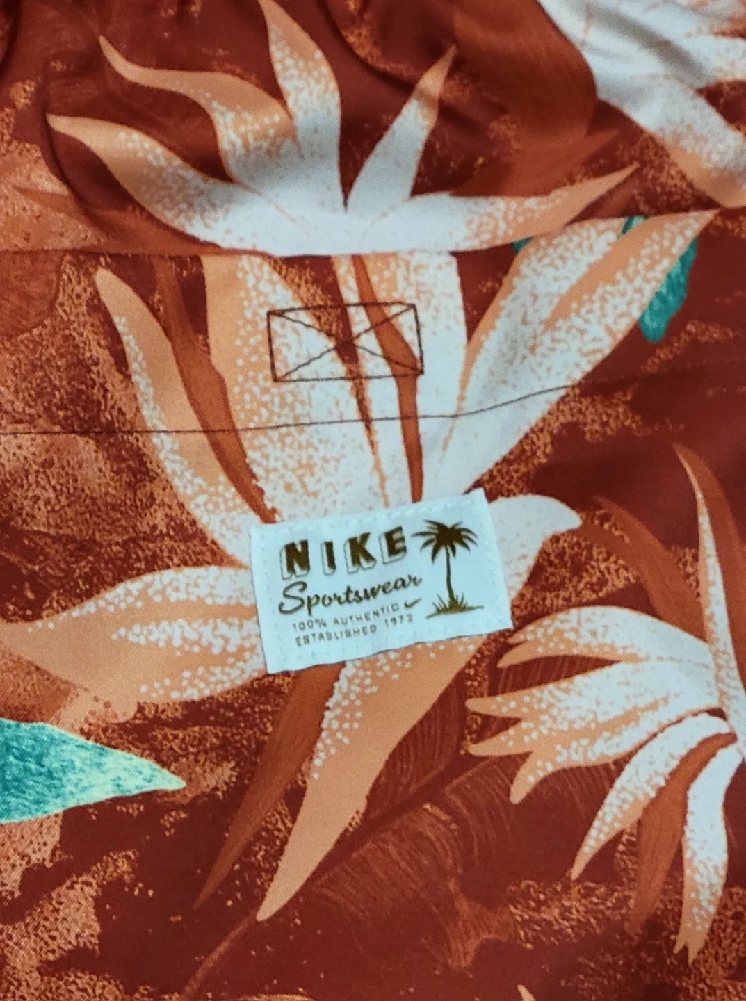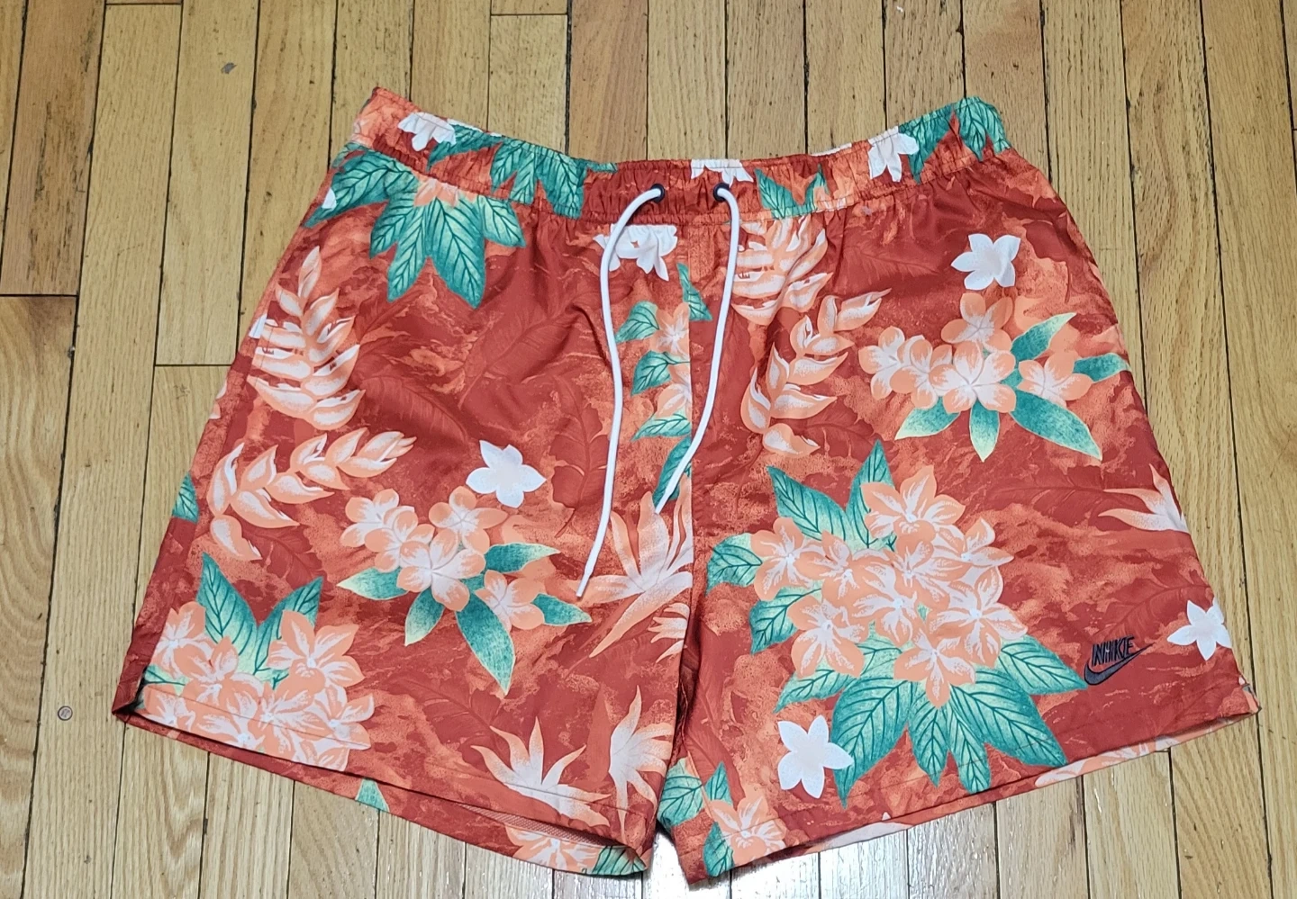 These Nike Sportswear swim trunks have a vibrant floral pattern. They feature a standard fit and an above-knee length. Elastic waistband with drawstring. Side pockets.