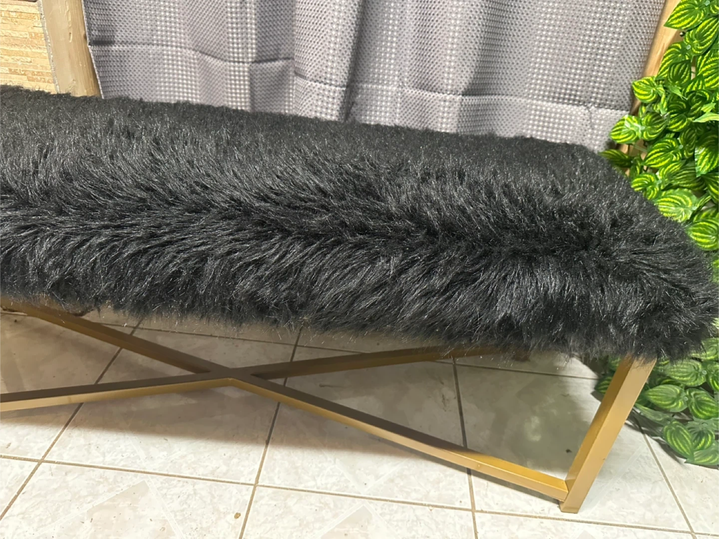 Black Faux Fur Bench with Gold X-Leg Base