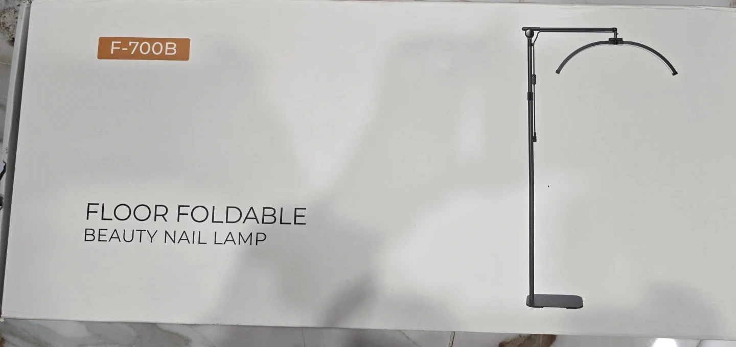 This is a floor foldable beauty nail lamp, model F-700B. It's made from ABS+PC+Aluminum+Iron. The product size is 70x4x4cm. It has a Lumen output of 4000lm and a power supply of DC 24V/2A. This lamp is useful for professional beauty treatments.