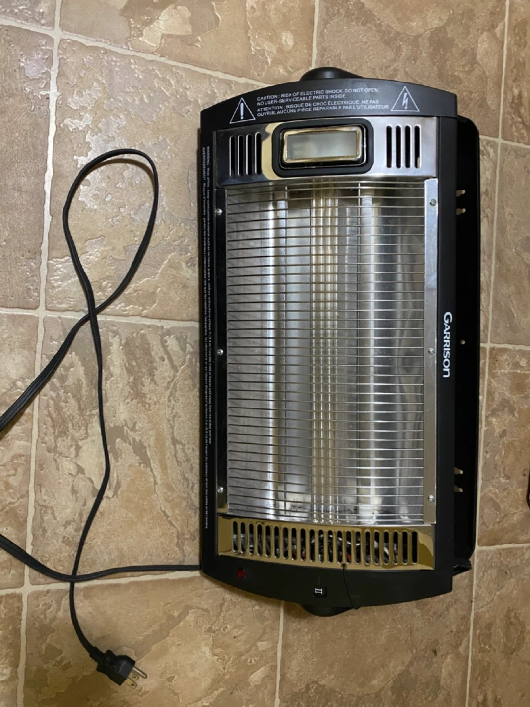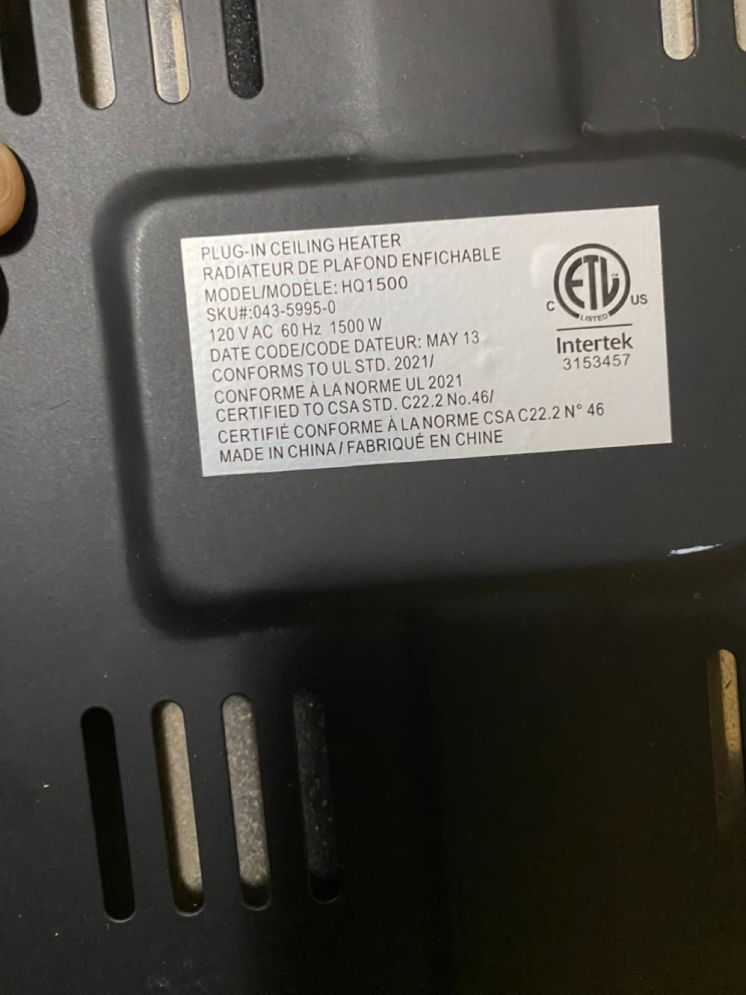 This Garrison plug-in heater is model HQ1500. It's 120 V AC, 60 Hz, 1500 W. Conforms to UL STD. 2021.