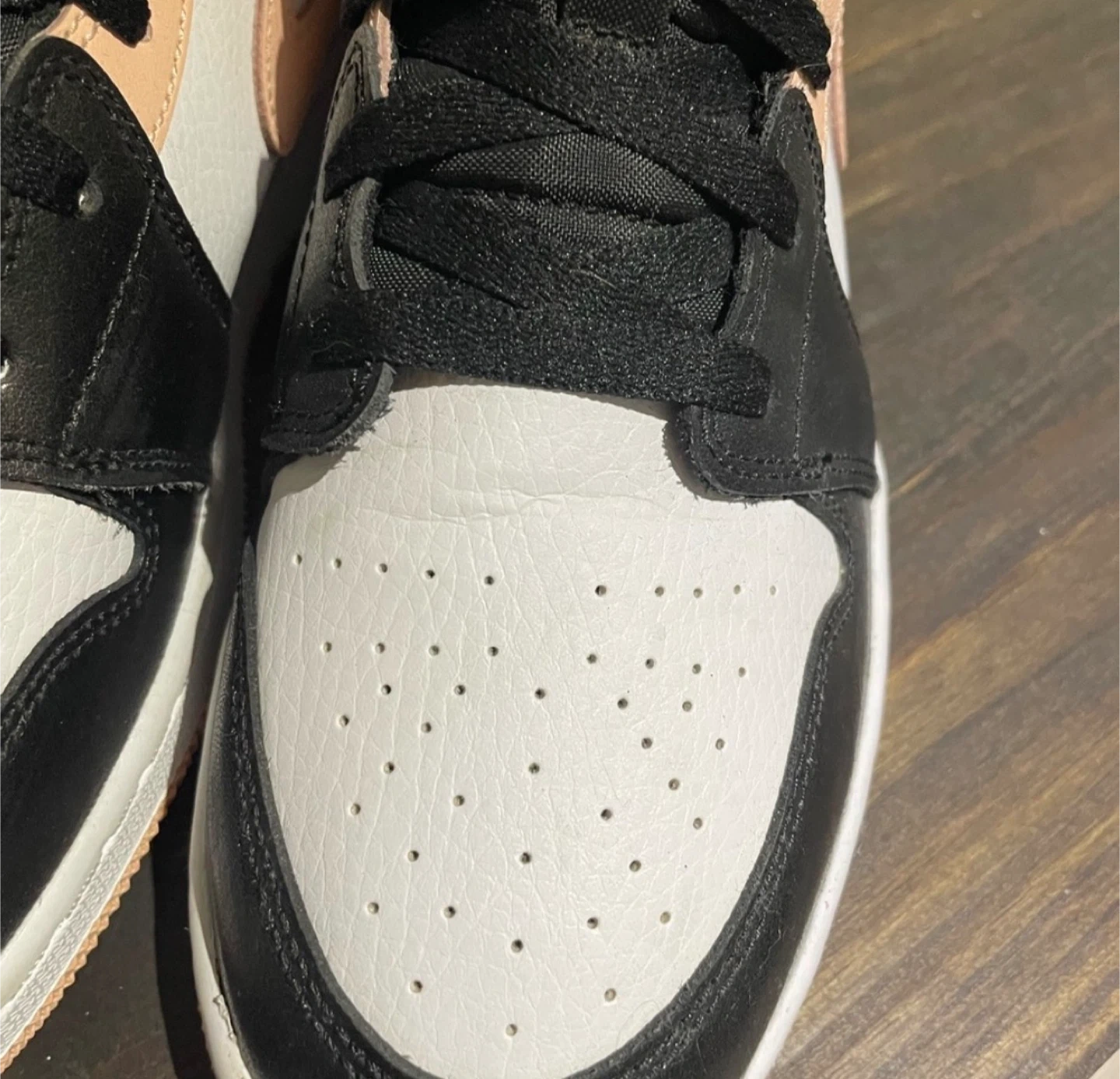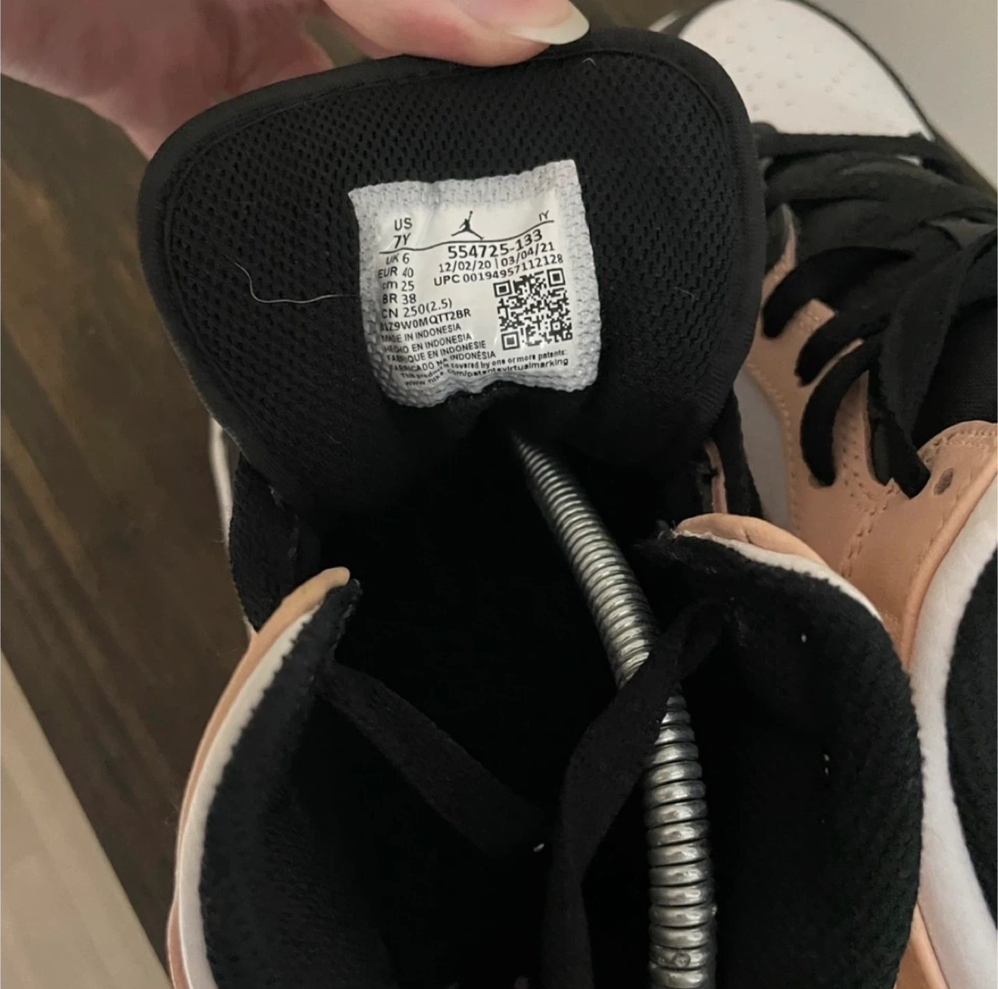 Selling a pair of Nike Air Jordan 1 Mid sneakers in size 7Y US. They feature a stylish combination of black, white, and peach colours. Great for everyday wear!