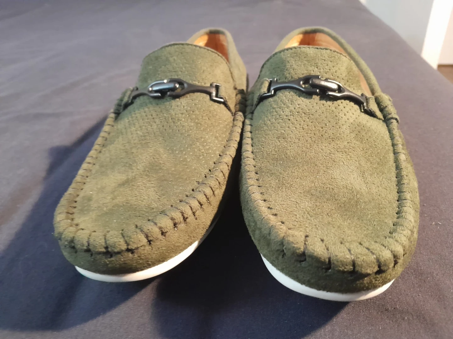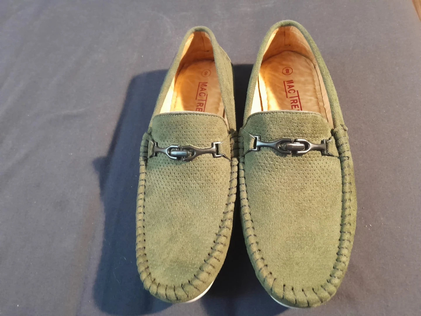 Hello friends,I am selling a pair of stylish, premium quality army green color suede shoes .They are very comfortable with padded lining Never worn ,brand new condition..It can be used with formal or casual wear .if interested Msg me.Price is fixed,already on excellent price .