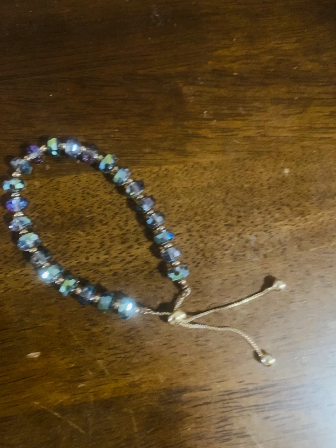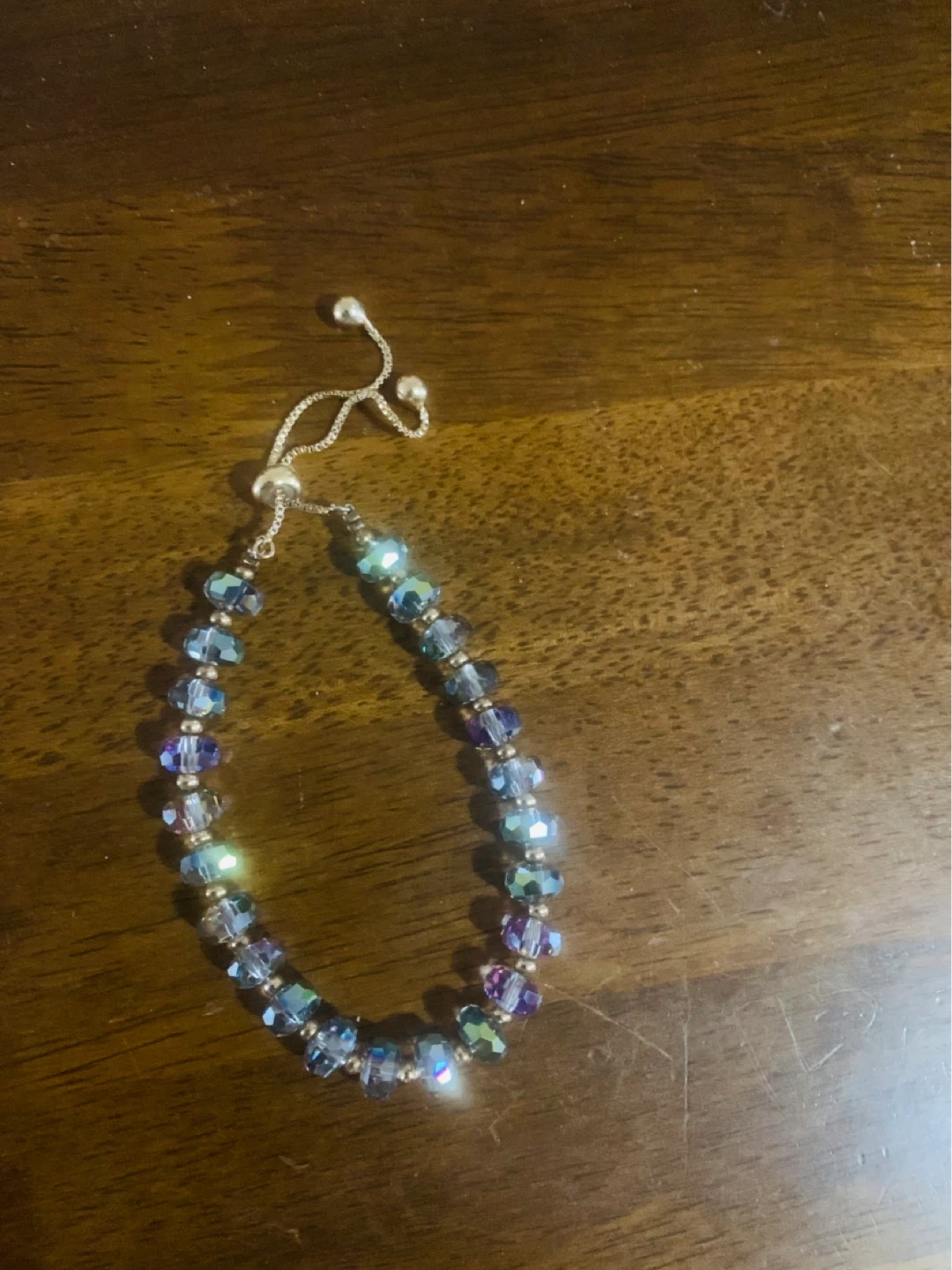 Sparkly bolo bracelet with blue and purple faceted beads. It features a sliding clasp for an adjustable fit. This piece adds a nice touch of shimmer to any outfit!