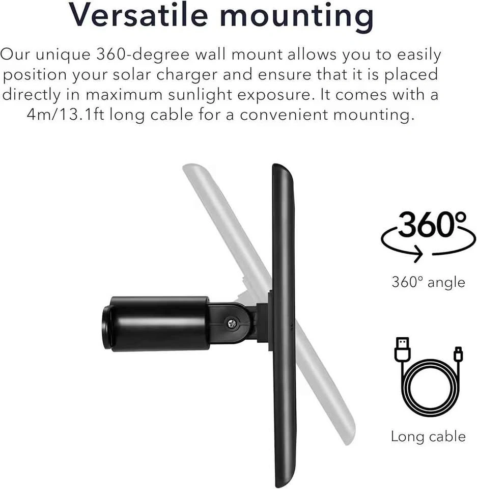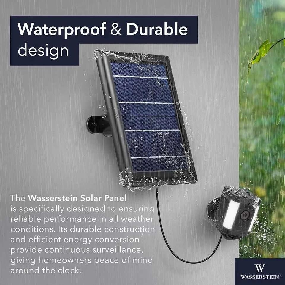 Wasserstein 3-pack solar panels for Ring Spotlight Cam. Battery & other compatible cameras. Features efficient solar cells, 360° adjustable mount, and 4m/13ft cables for easy positioning. Quick installation with included USB-C adapters, mounting brackets, screws, and anchors. Keep your cameras charged reliably with solar power.