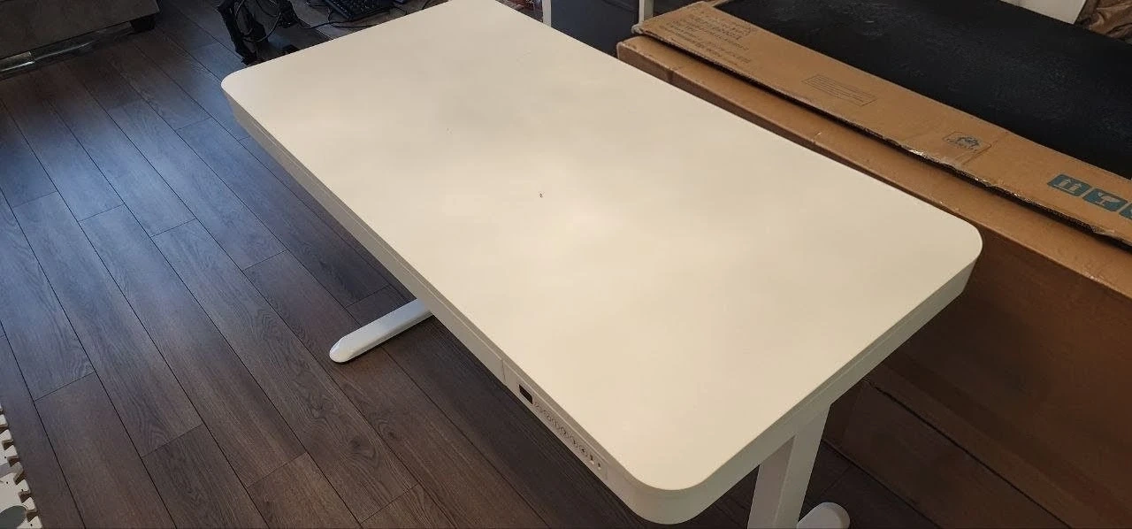 This is a brand new flexispot white standing desk with a drawer. It has an adjustable height feature controlled by buttons on the side. When it got delivered there was a small damage spot on the top (image 3). Never used, just tested to see if it works. Comes with the box.