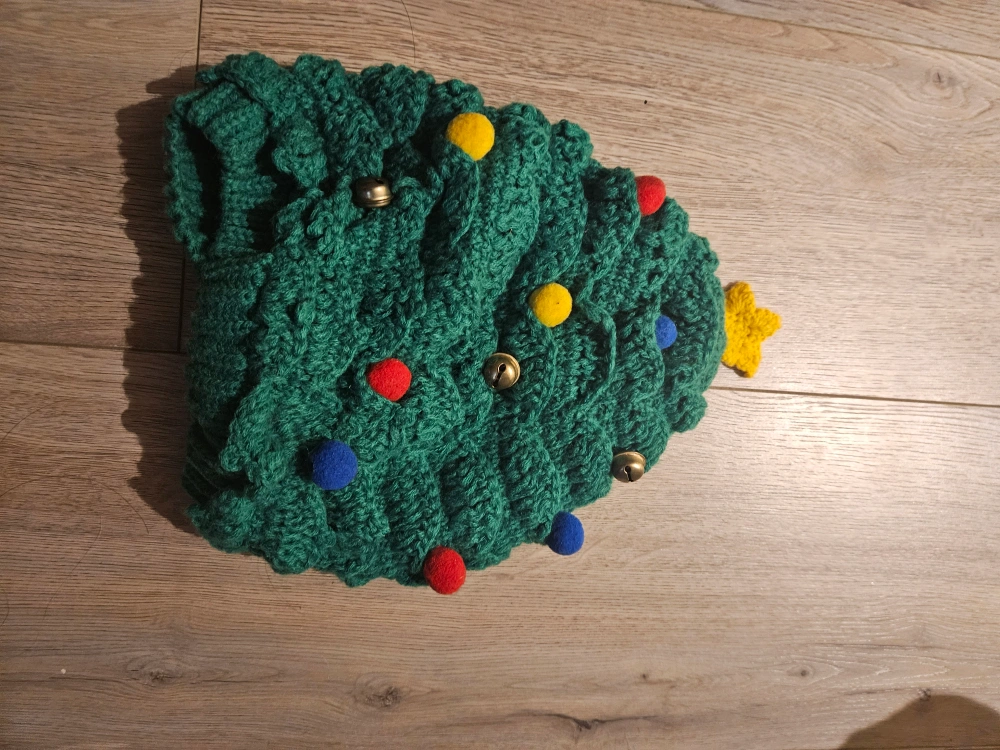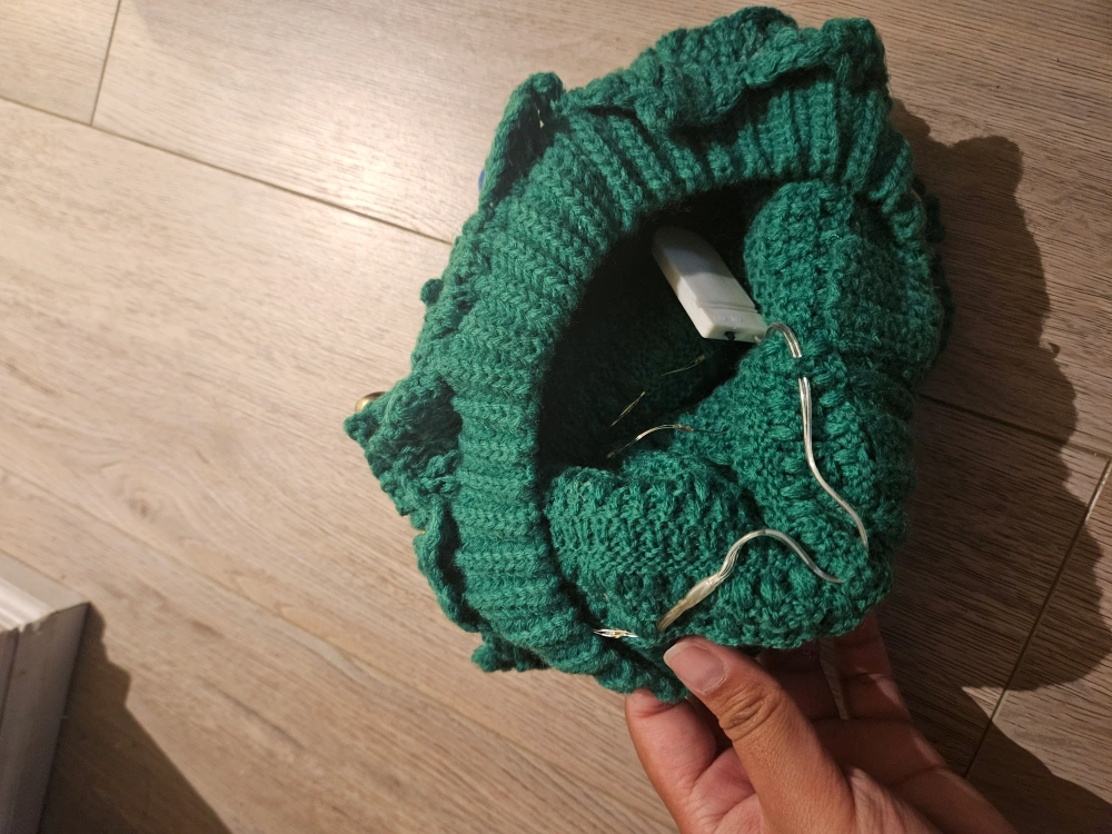 Christmas hat in the shape of a Christmas tree. On the inside are built in lights that light up the tree. The wiring is all on the inside