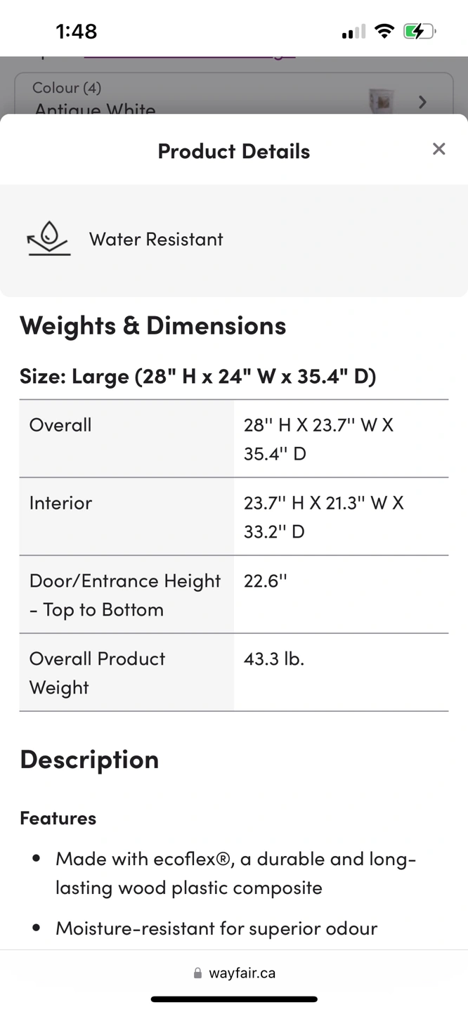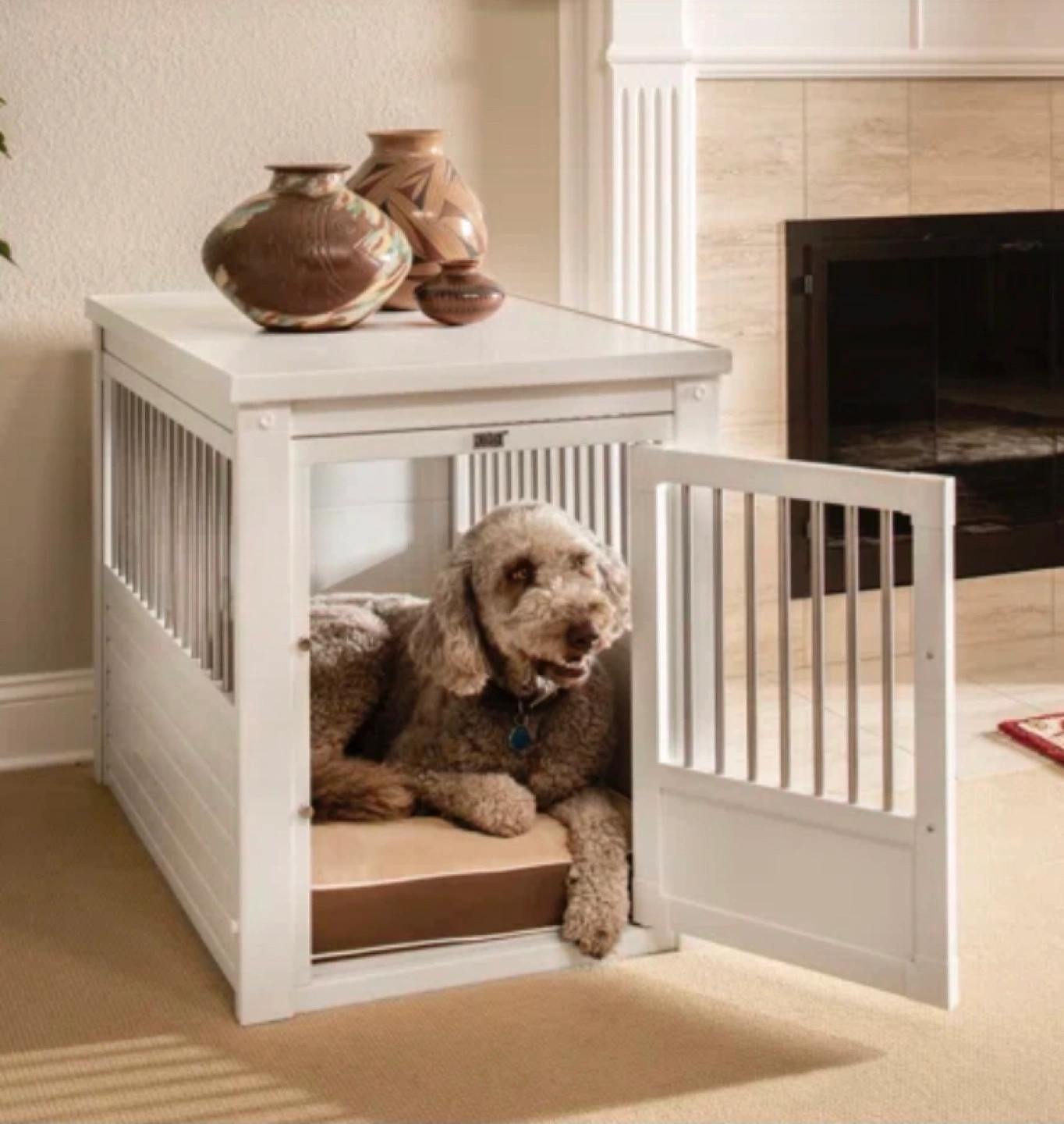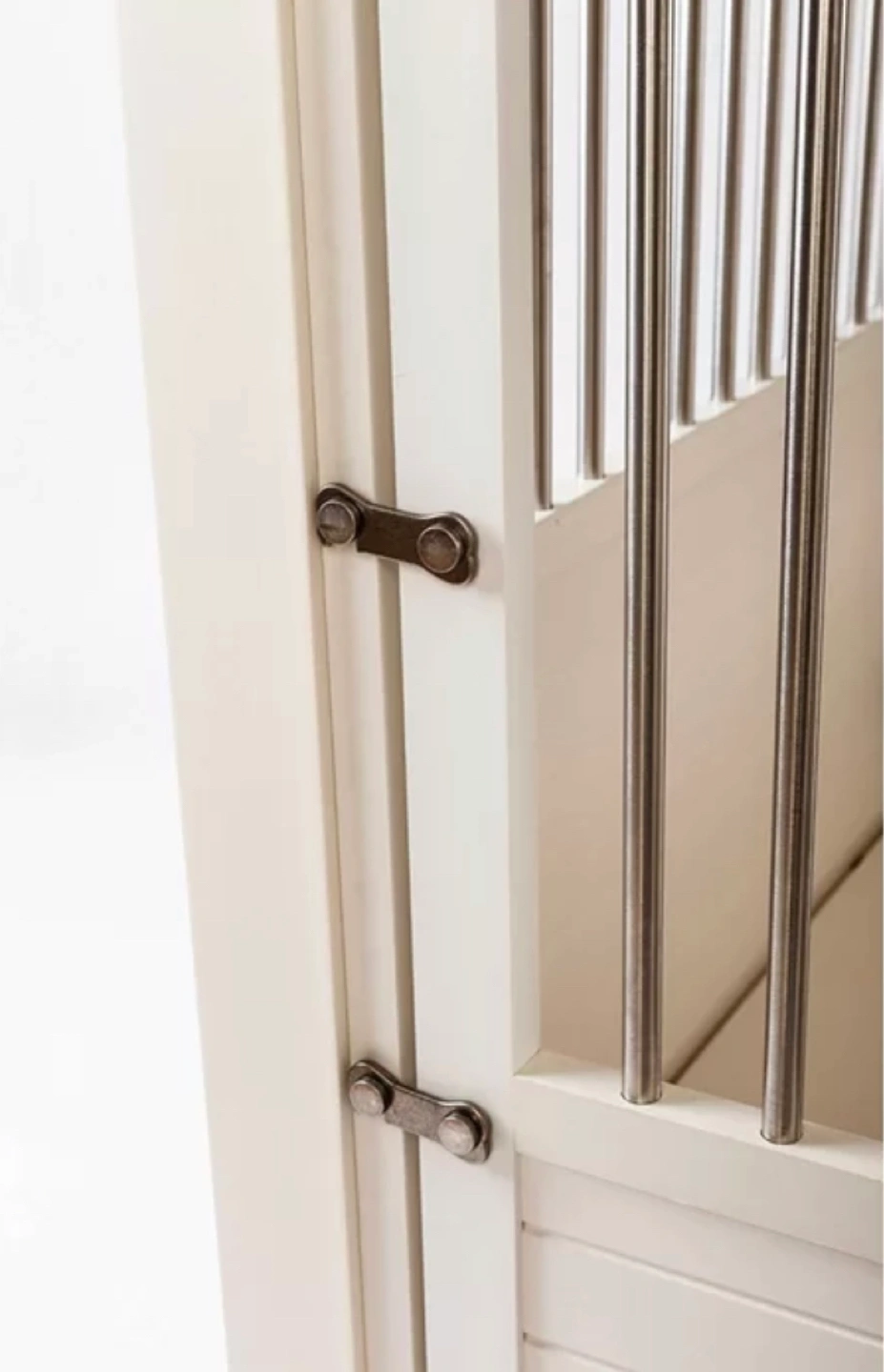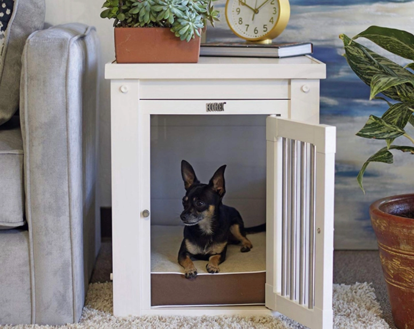 This ECOFLEX Dog Crate melds form and function into a crate that can double as a piece of your home decor. Use as an end table, an occasional table or a night stand. With a stainless steel latch, your pet will be secure in their own safe space. Made of ECOFLEX, a nontoxic recycled plastic-wood polymer composite material that won't warp, crack or split, Stainless Steel Spindles and latch.