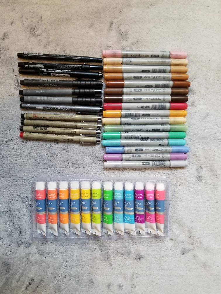 Markers are all double sided copics. Pens and markers are all used, but still have plenty of life left in them. Most of the paint colours are unopened.