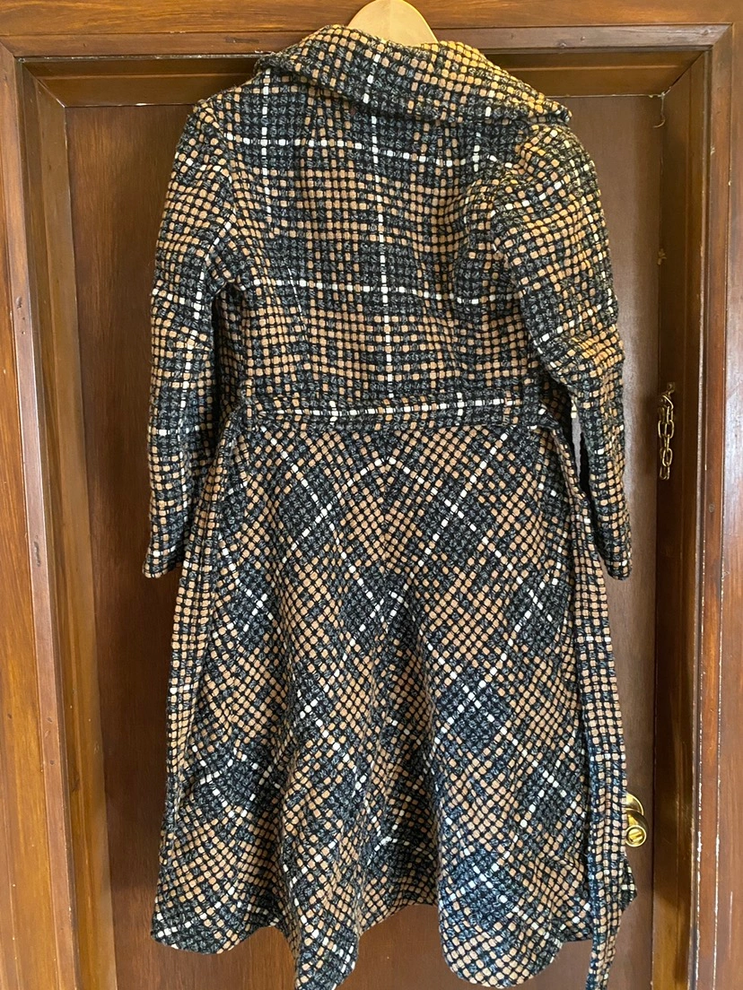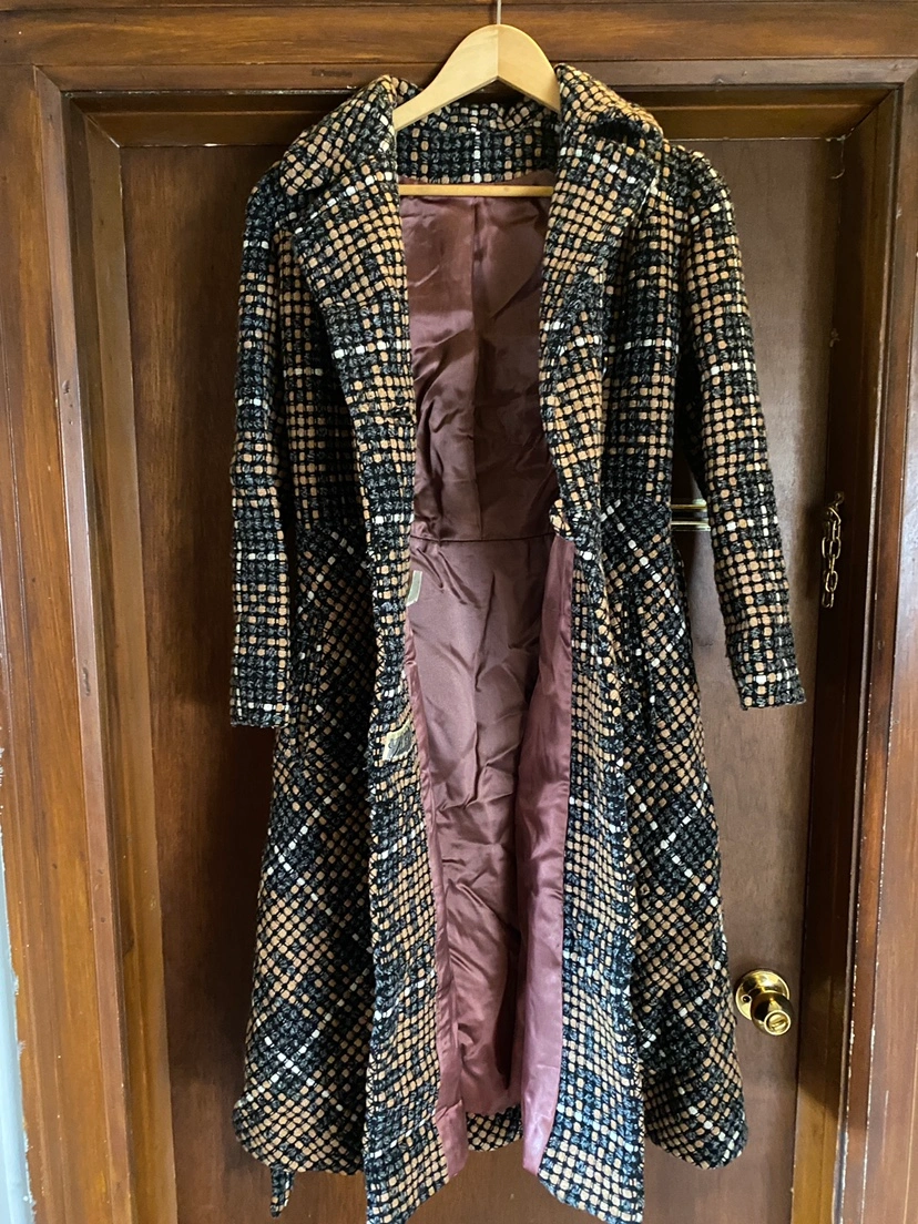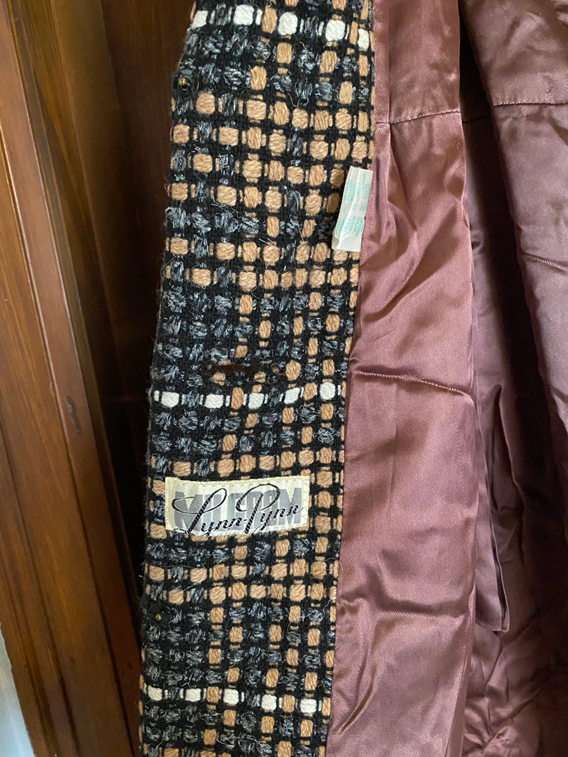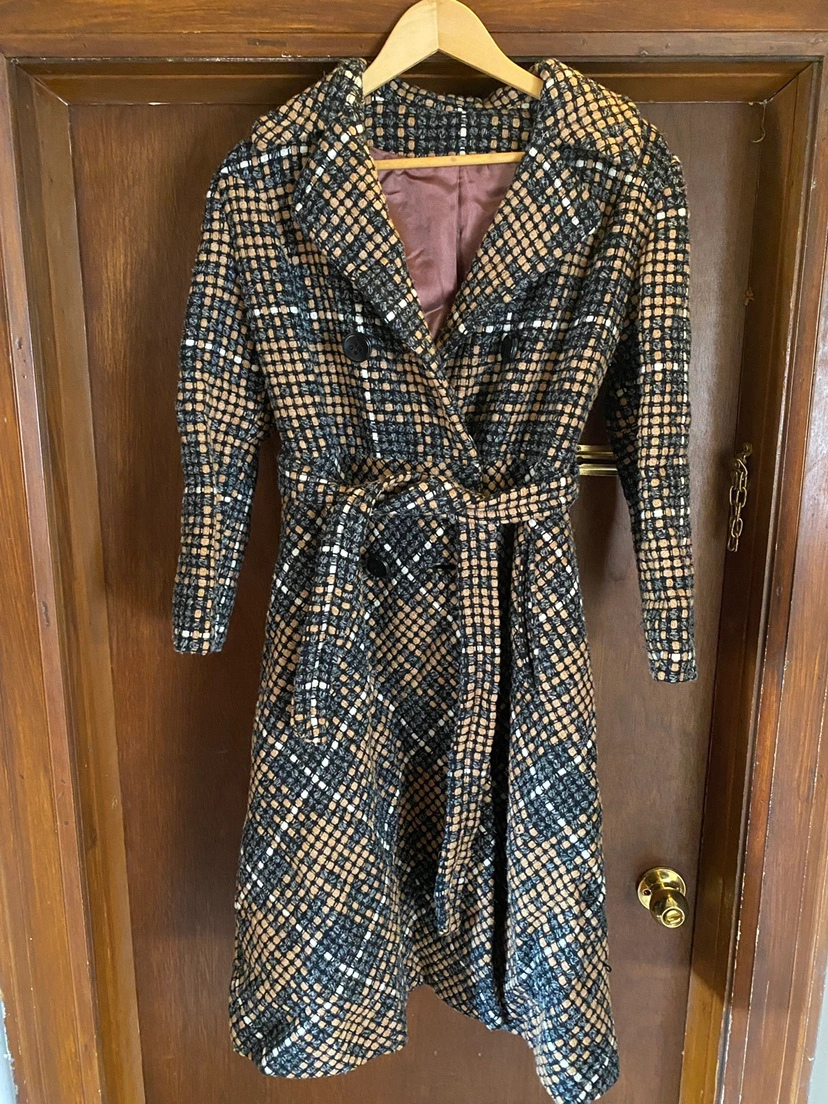 Vintage women’s winter coat (size small), steel blue, white, and peach crisscross pattern with a wine coloured lining. Bought from an estate sale last year and never worn since. Excellent like new condition