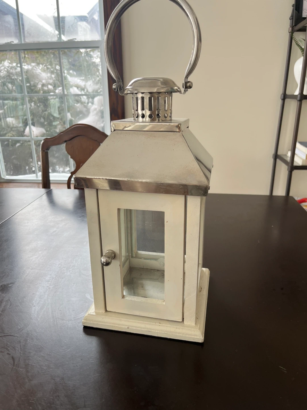 Decorative white wooden lantern with a silver metal top and handle. It features glass panels and a small door with a knob. Smoke and pet free home. Can also meet in Bradford