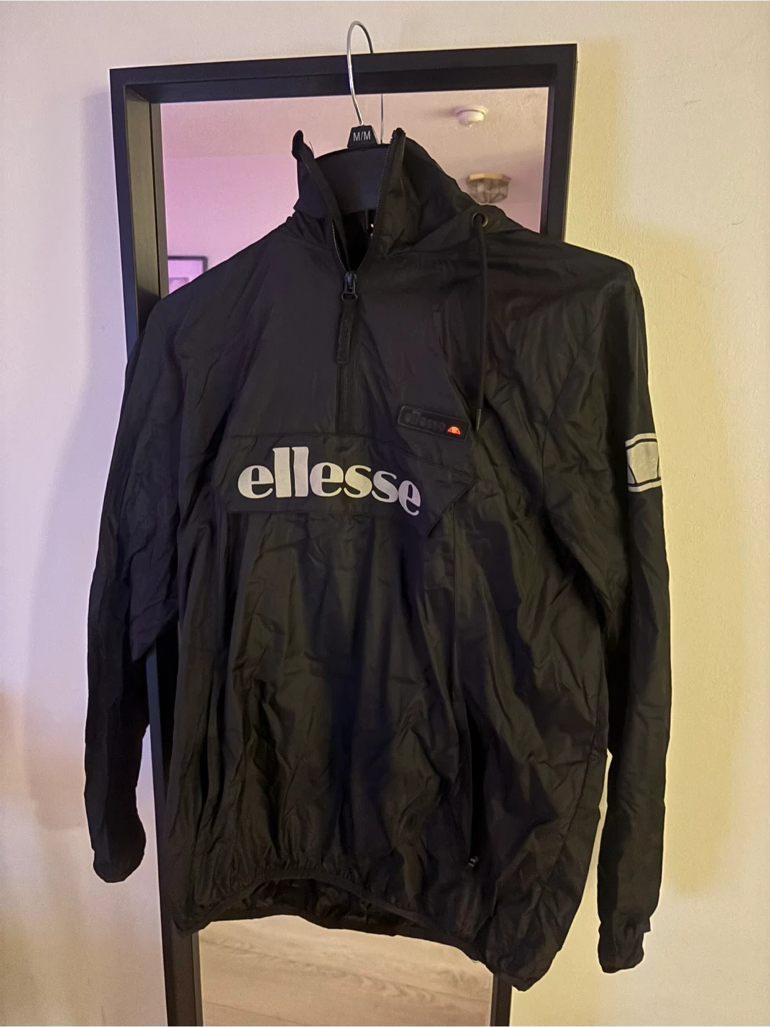 This is a black Ellesse pullover jacket. It's a size L. Made with a lightweight material, it's perfect for everyday wear or light athletic activities.