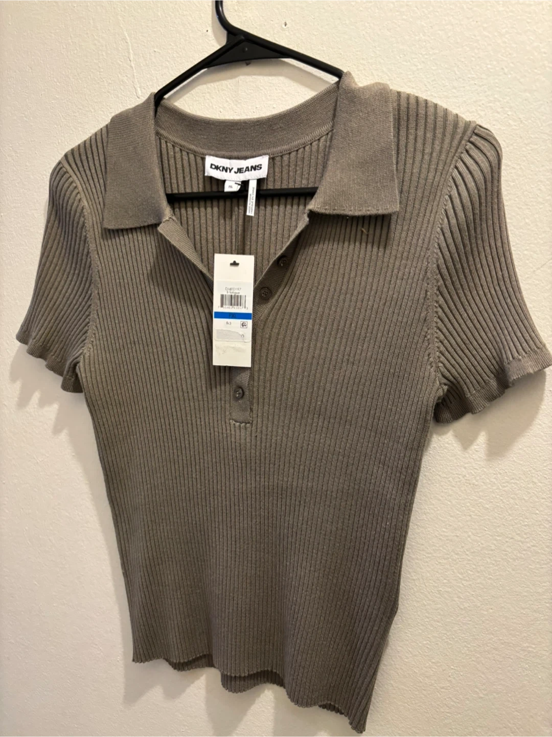 This is a DKNY Jeans women's ribbed knit shirt. It's a size PXL and features a collared neckline with button closure. The shirt is a taupe color.