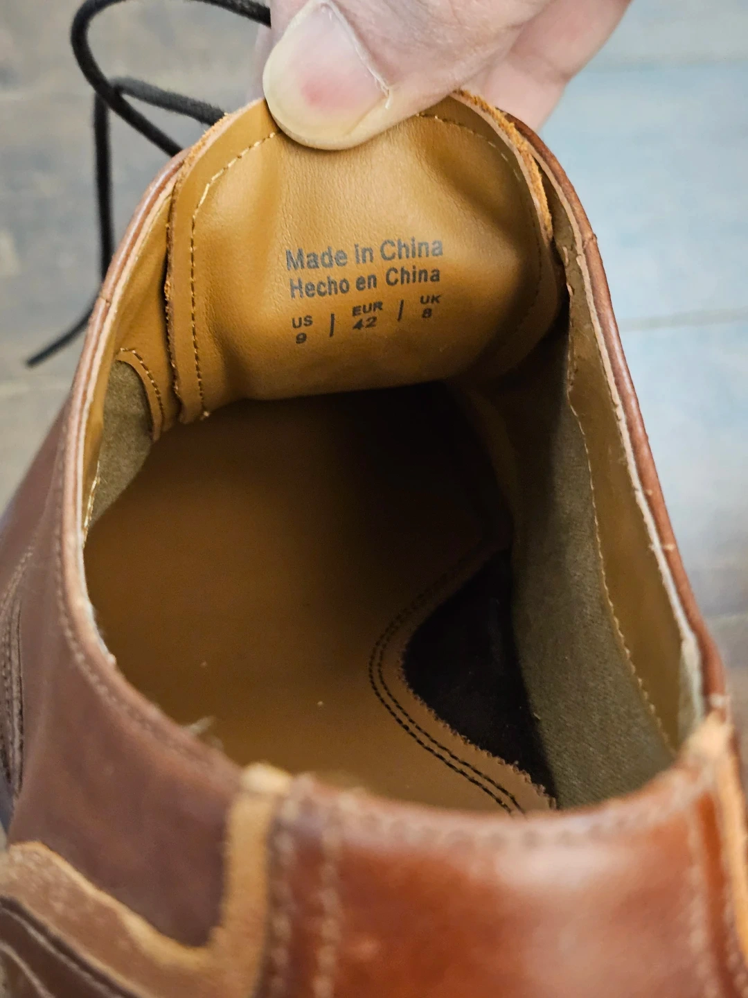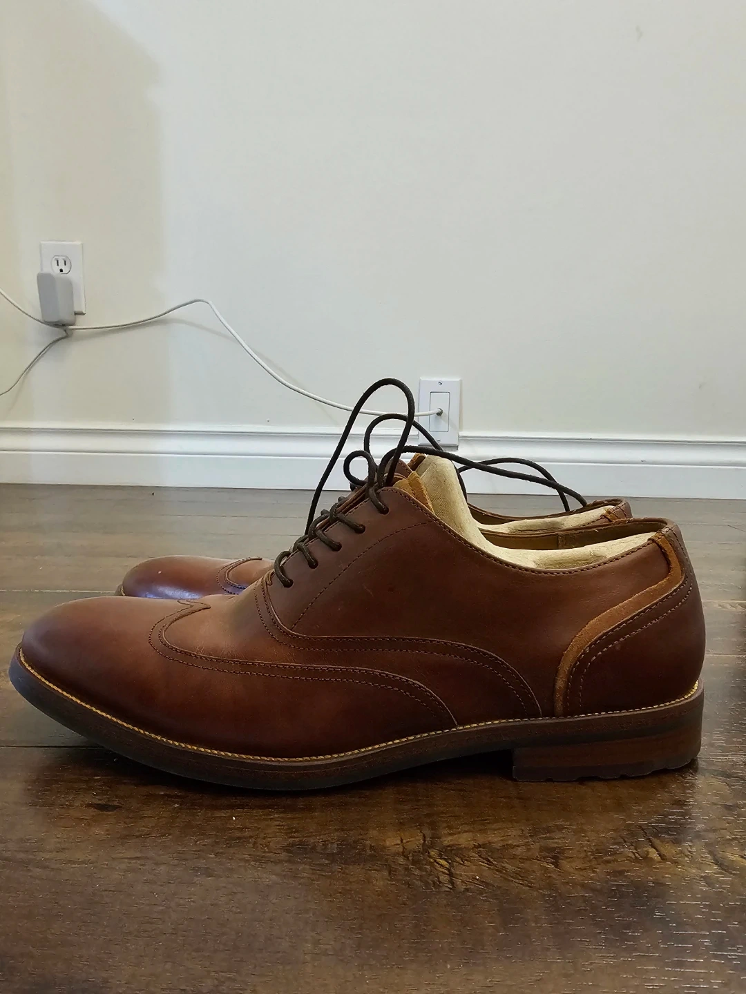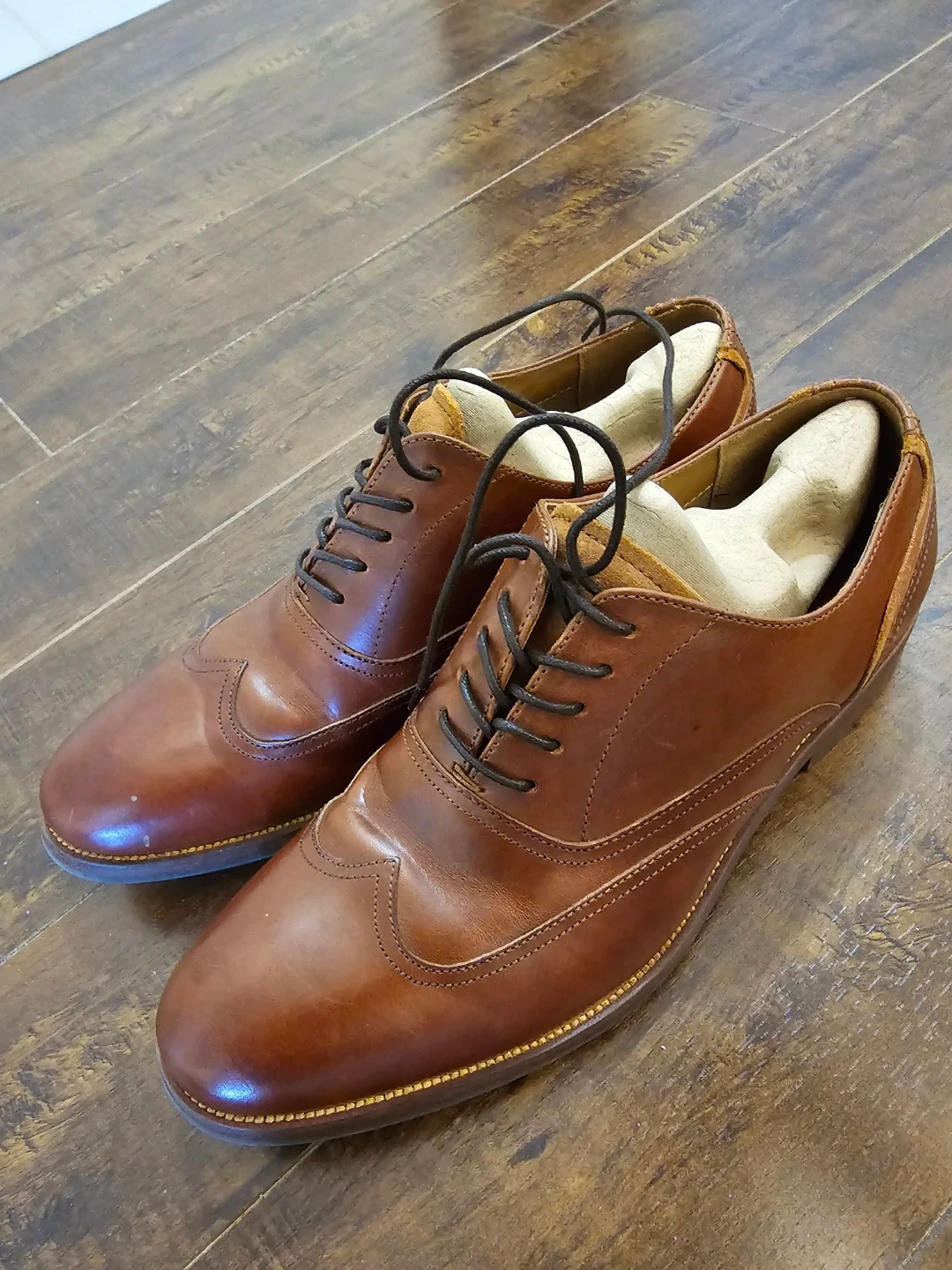 Stylish brown leather wingtip Oxford dress shoes. Classic brogue detailing and lace-up closure. Genuine leather upper and lining for comfort. Durable sole for everyday wear.