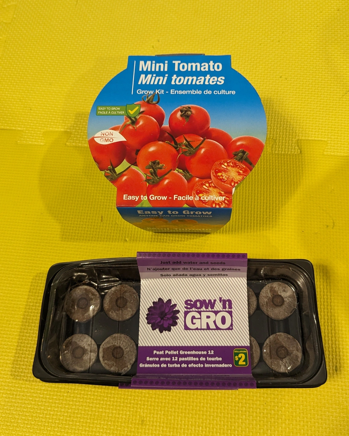 12 peat pellets with grow container and a pot with potting mixture in it. Please note there are NO tomato seeds with the pot.