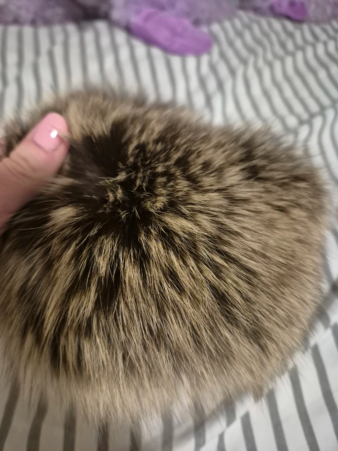 A cozy real fur collar. It's lined with satin and has a natural brown and grey colour. It's the perfect accessory for adding warmth and style to any jacket or coat!