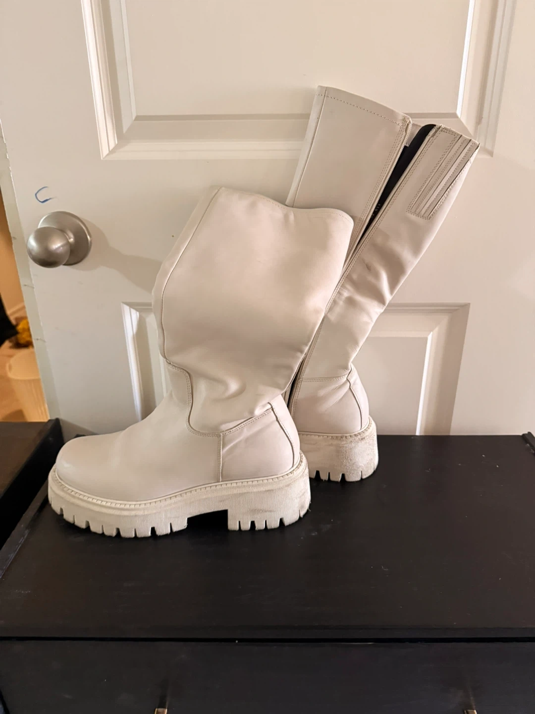 Cream white knee-high boots with a chunky platform sole. They feature a side zipper for easy wear. Material appears to be faux leather.