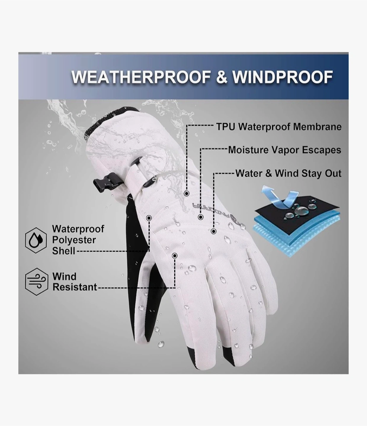 1. 【Waterproof & Windproof】Using TPU waterproof inserts can block the entry of water into snow gloves. A coating of waterproof material covers the outer shell fabric. You can keep your hands warm and dry when playing in the snow, provided you don't immerse them in water. Elastic knitting cuff enhances fit and provides effective weather protection against cold air