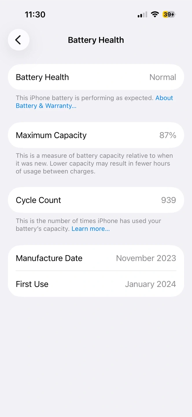 This is a pink Apple iPhone 15. Battery health is normal with a maximum capacity of 87%. Manufacture date is November 2023 and first use was January 2024. Cycle count is 939.