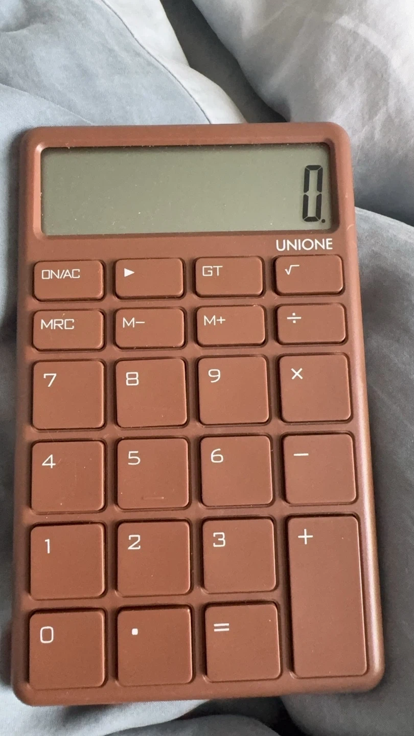 This is a Unione brand calculator. It's a basic model with number keys, arithmetic functions, and memory buttons. It has a clean display and a muted brown colour.