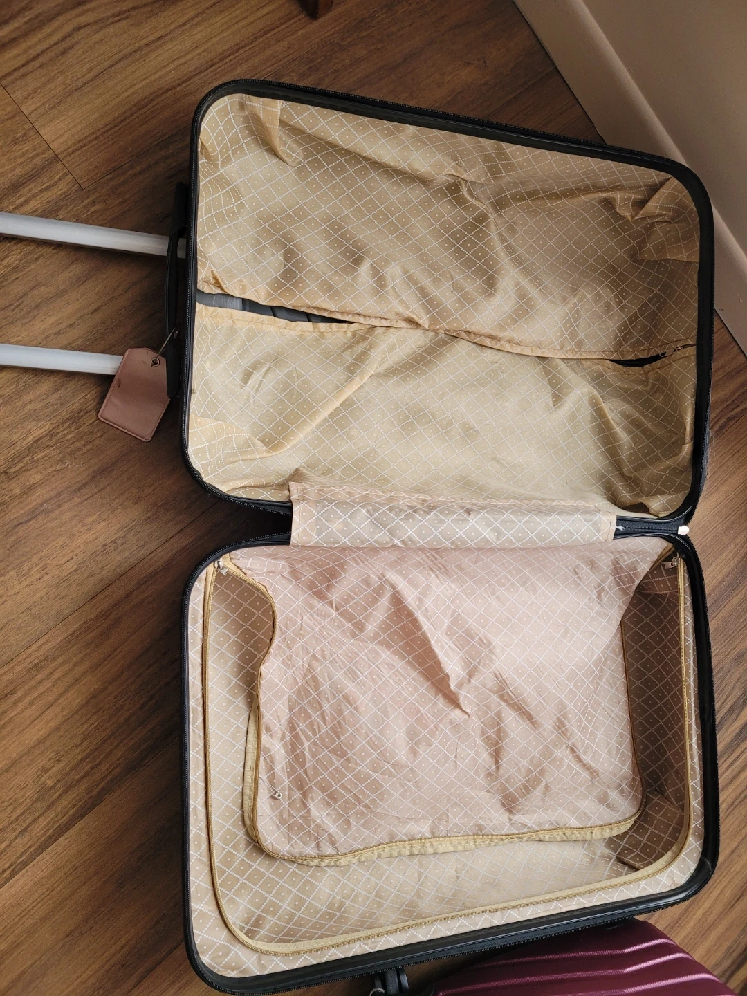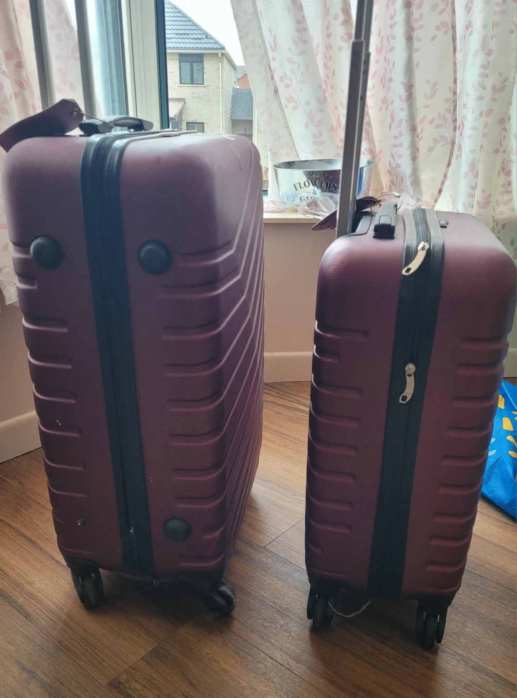 Two burgundy hard-shell suitcases from ION. Includes one large and one carry-on size. Both have wheels and retractable handles.